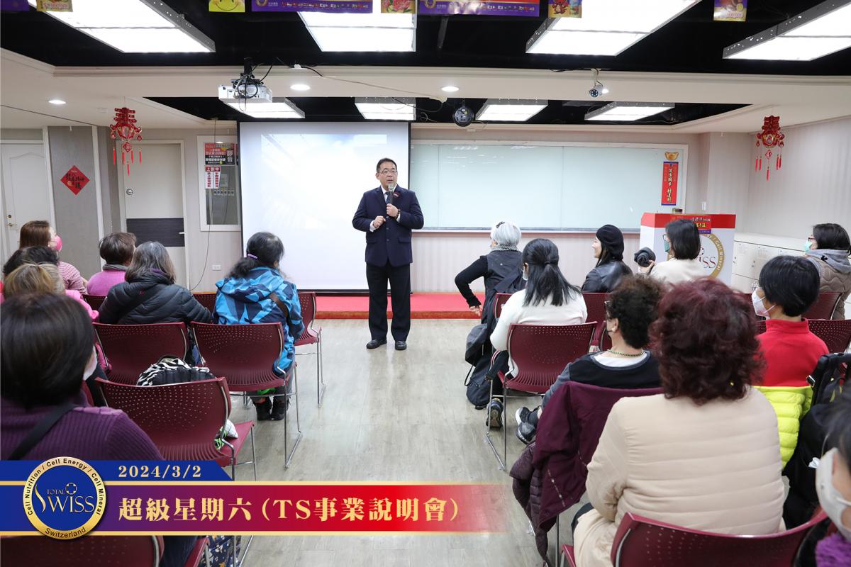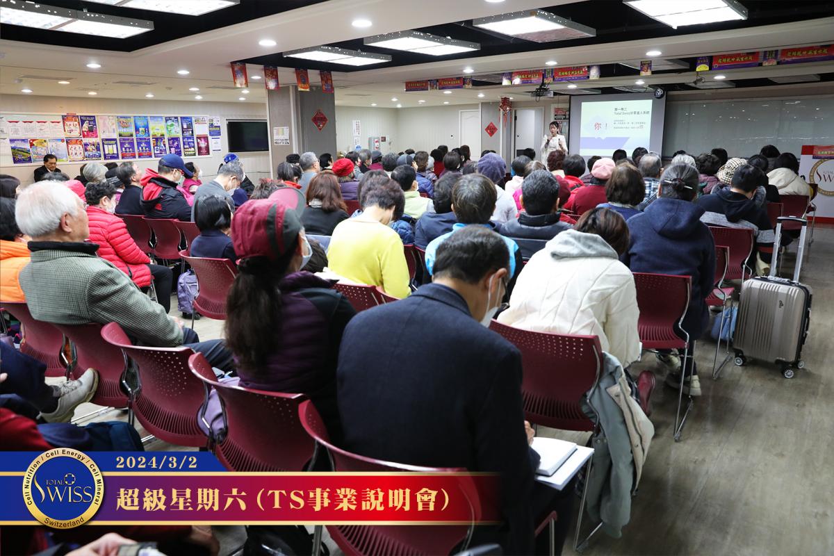 首場超級星期六於3月2日下午兩點在台北公司四樓教室正式登場,課程由在將官班、特訓班受到肯定的Johnny老師以及在Total Swiss任職九年,深諳Total Swiss核心優勢與王博士想法的Ivy副總搭配擔綱,現場共有114位夥伴新人參加,另外還有許多總裁、皇冠總裁前來陪同。
