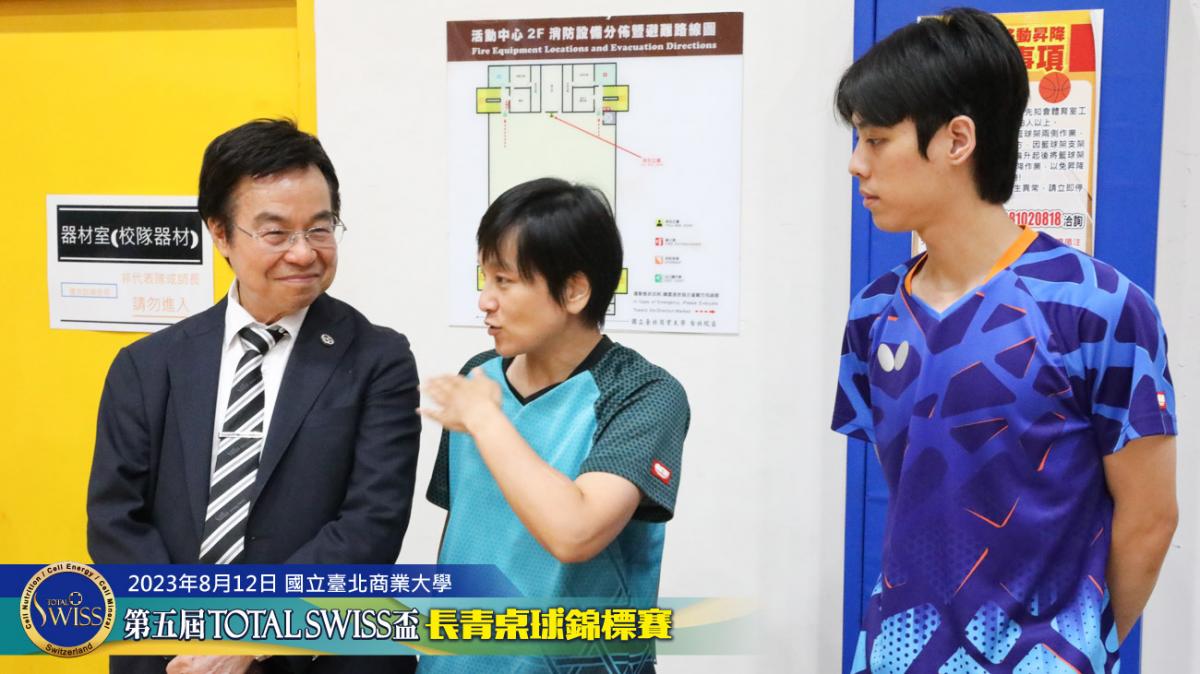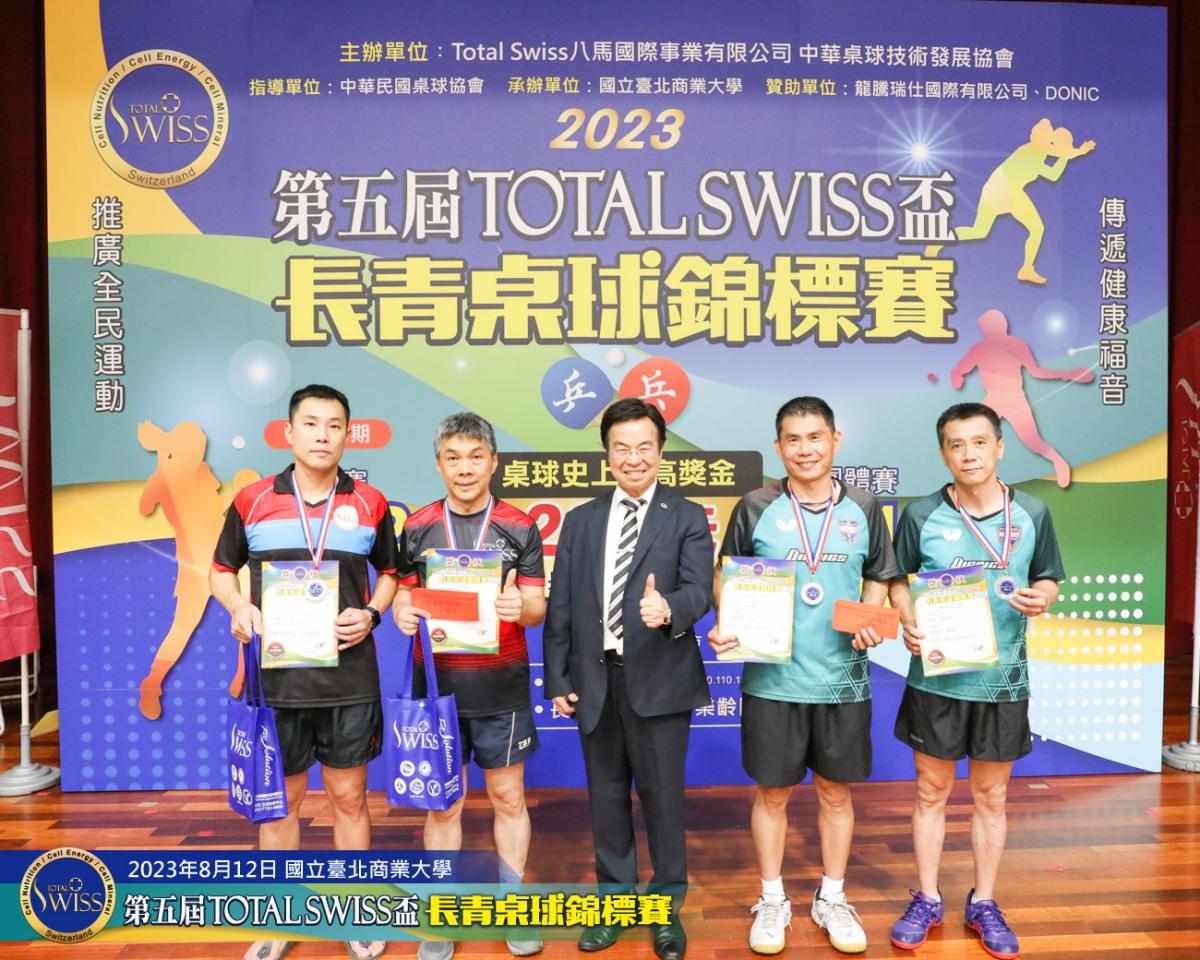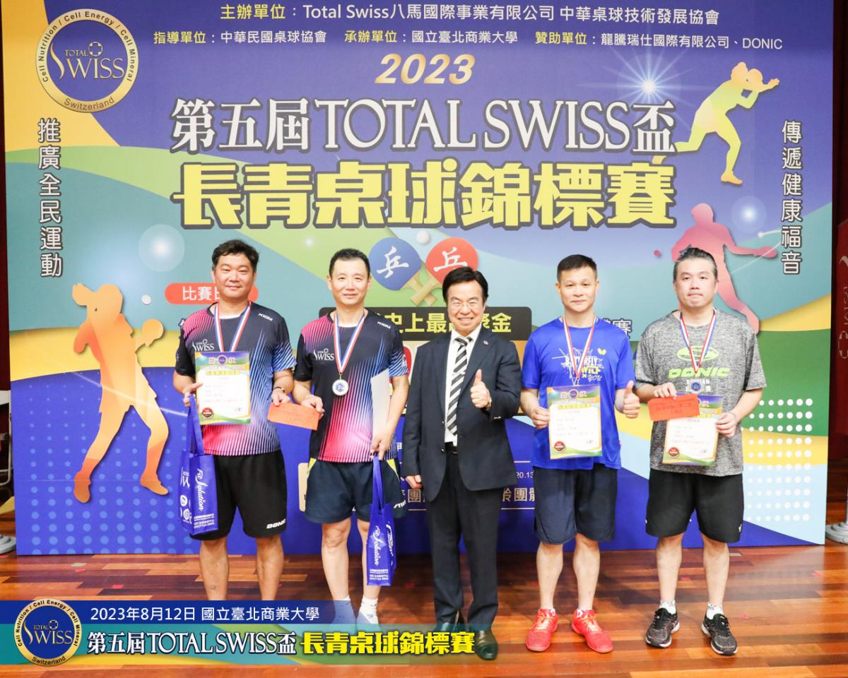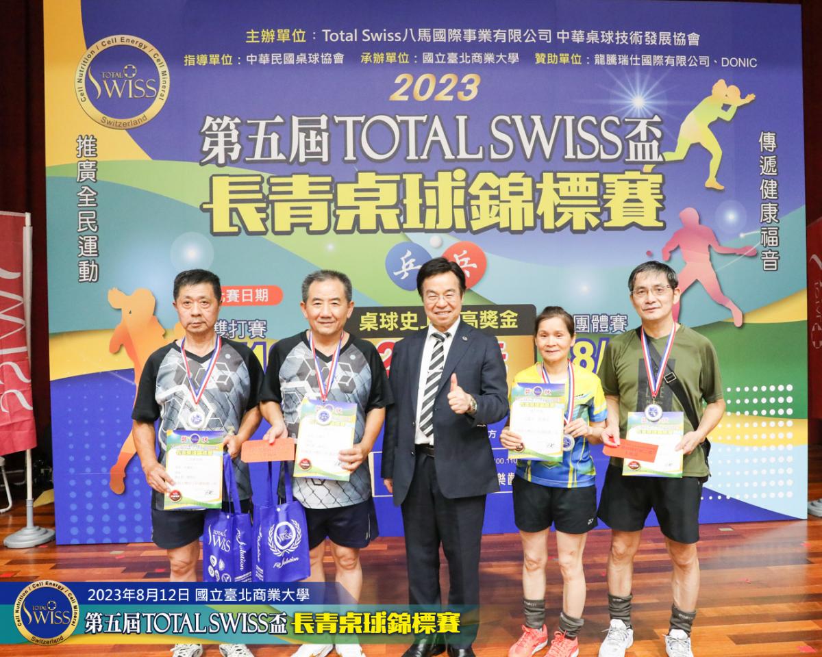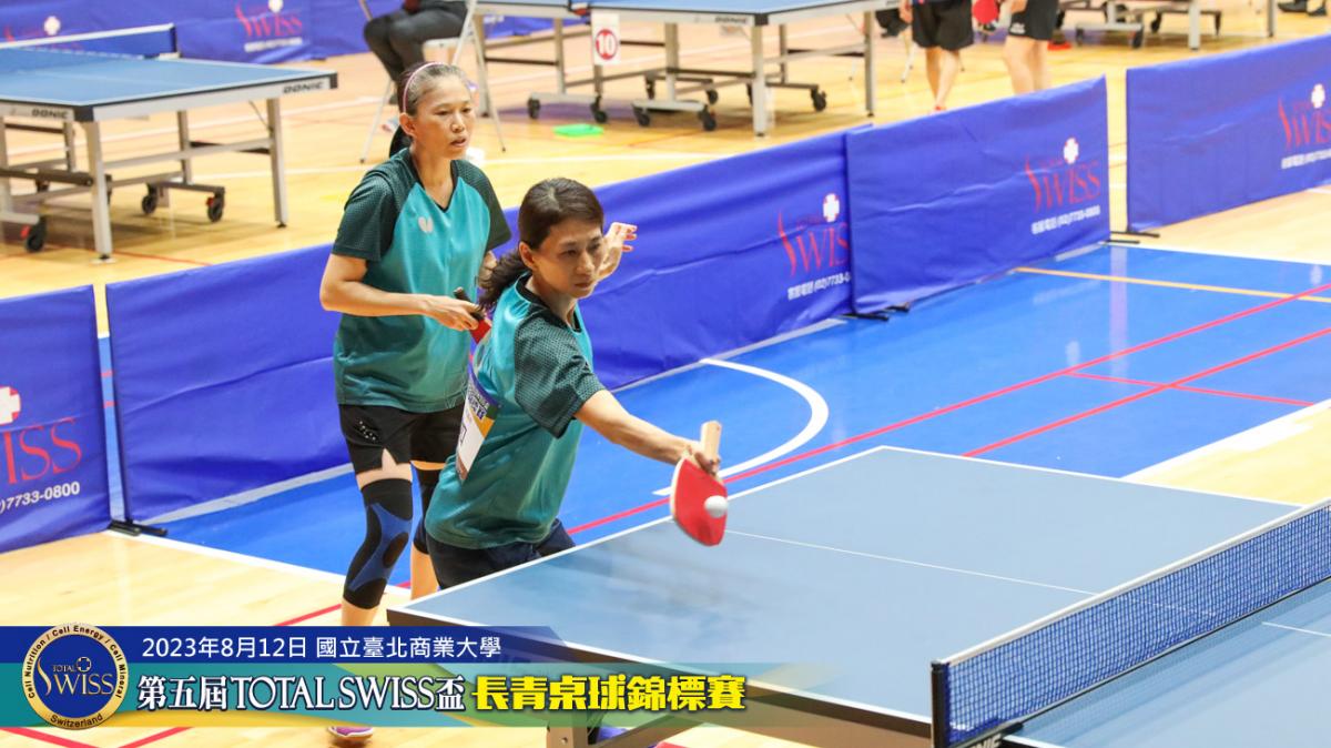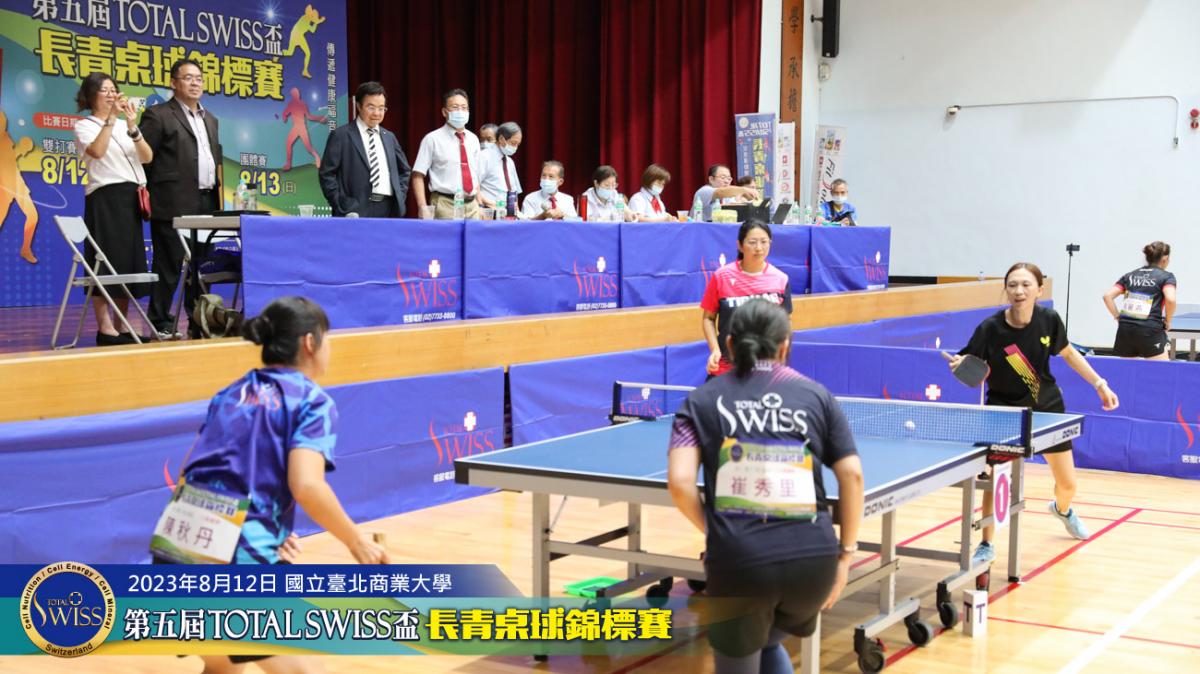 2023年8月12日上午9點鐘,第五屆Total Swiss盃長青桌球錦標賽在台北商業大學活動中心正式開打,比賽共分兩天進行,第一天登場的是80歲至130歲6個歲組的雙打比賽,一共吸引三百多位年齡40歲至82歲之間的桌球猛將報名參加。