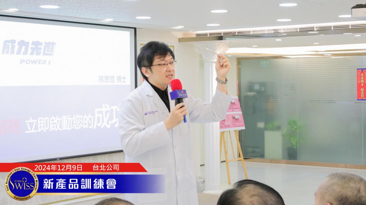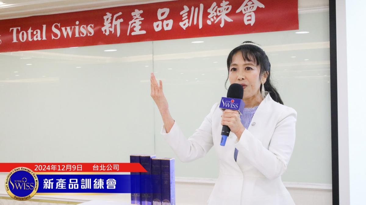 12月9日,Total Swiss全球頒聘大會進入第6天,為上千名來台灣學習的全球夥伴舉行一系列新產品訓練會,包括熊思愷博士講解威力棒與全球基因檢測商機、陳怡芳博士講解如何用基因檢測搭配細胞營養避免風險、創造財富,最後再由王博士講解速癒樂、利保晶、關固力、關活利、極光淨白、藍銅胜肽等產品。