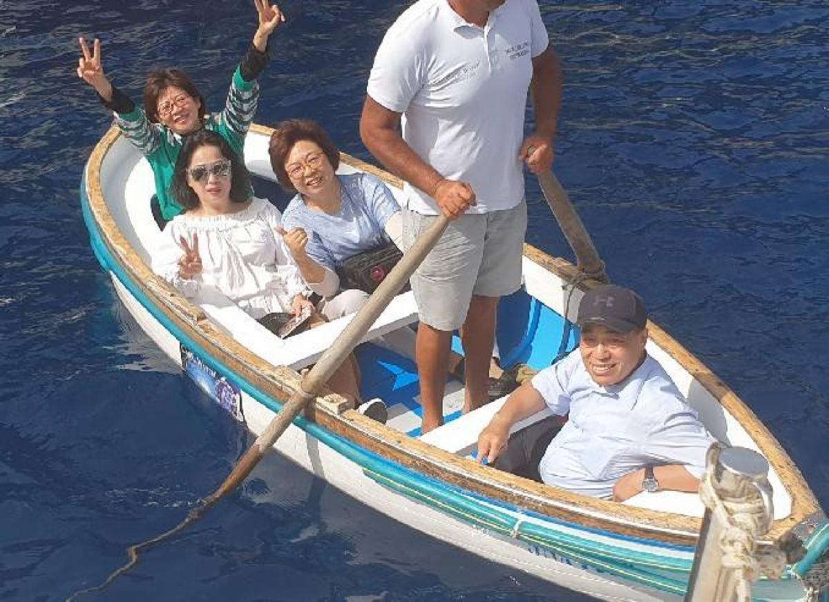 在拿坡里晨曦中甦醒,今天(6月12日),六月團與卡布里島藍洞及阿瑪菲海岸,有兩場藍調的約會。 首先,六月團要尋幽探秘的目的地,是擁有世界七大奇景美譽的藍洞。 探訪藍洞不只要看季節,還需要交一點運氣。 冬天,藍洞通常會因為海上風浪的關係不予開放;即使在夏日時節,如果運氣不好,碰上藍洞風浪或潮位因素,也有可能閉門謝客,使人徒留緣慳一面的遺憾。 這一次,Total Swiss羅馬之旅六月團在最適合探訪藍洞的日子裡來到了藍洞。 藍洞裡的藍色十分夢幻,故而也被稱為上帝調出的藍色,好似上帝才能擁有的私房色彩。 根據研究,藍洞的夢幻色調,主要是因為洞口射入的陽光經海水吸收紅光後折射到洞內水面的特效。 六月團的夥伴們在王博士的帶領下,果然好運當頭,順利進入洞內,在微波蕩漾的艄艇上,享有閃耀著光芒的上帝私房色彩。