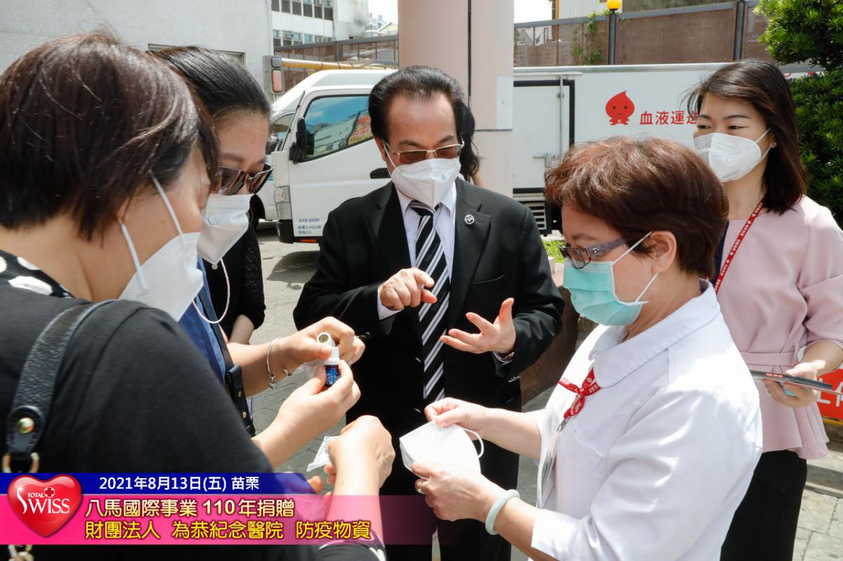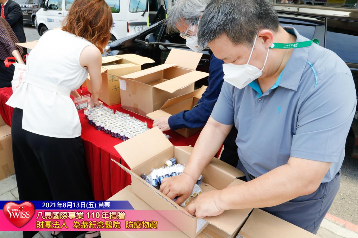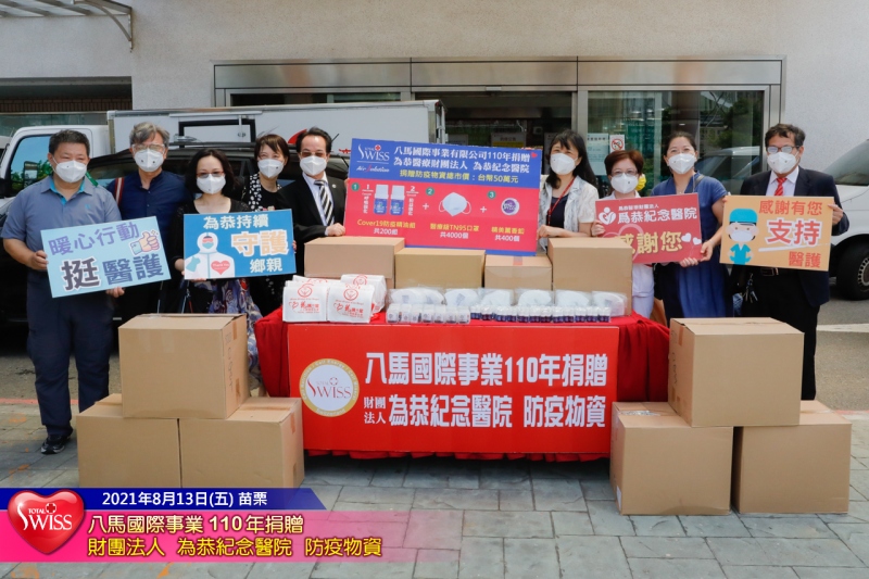 2021年8月13日上午11時,首場Total Swiss「用精油挺醫護」的Cover19防疫精油套組捐贈儀式,在苗栗縣頭份鎮為恭紀念醫院大門口舉行。
