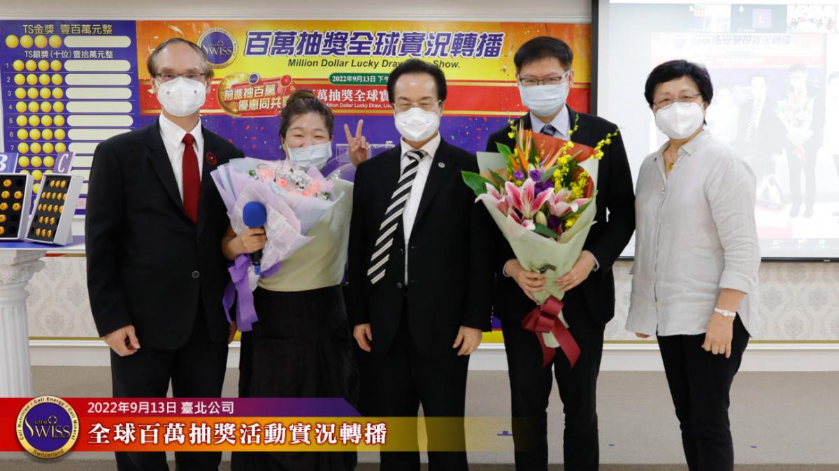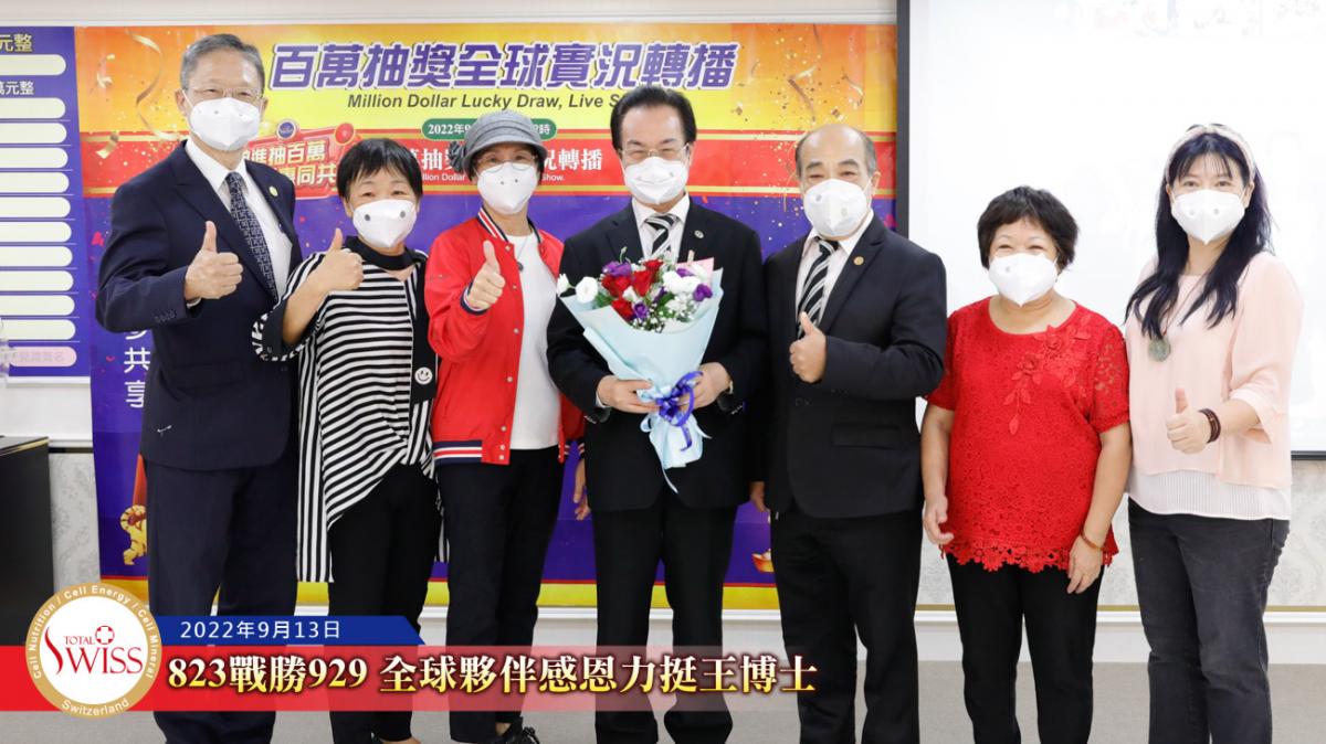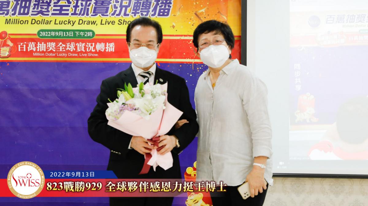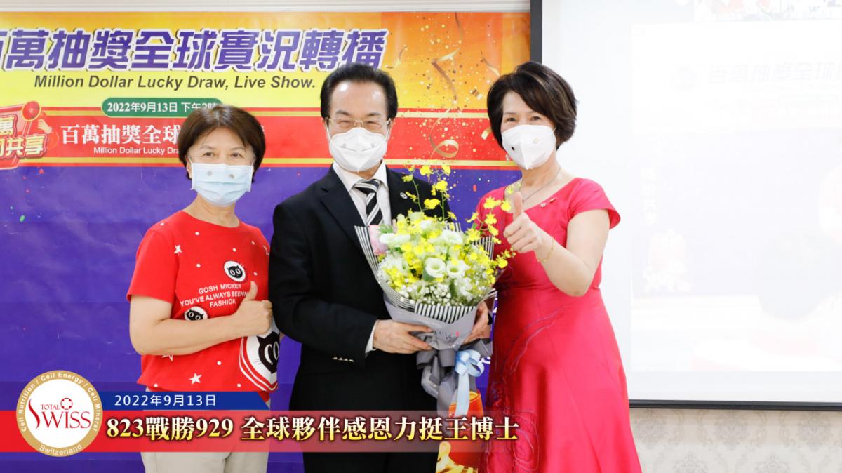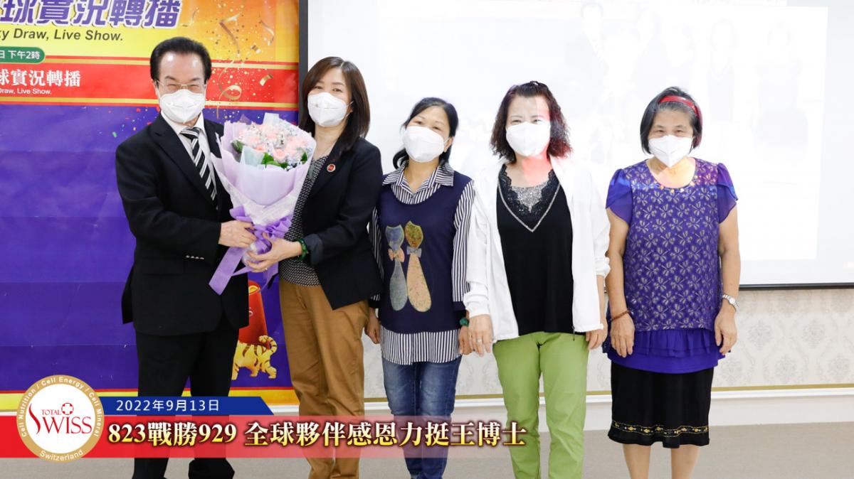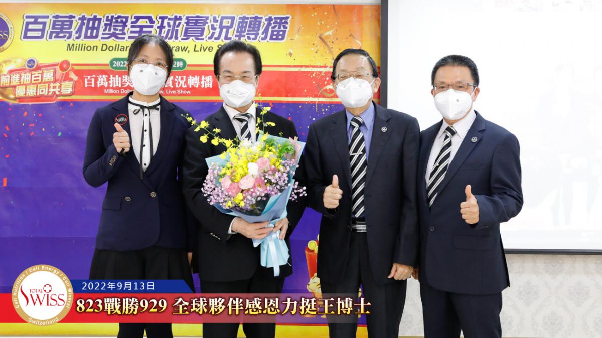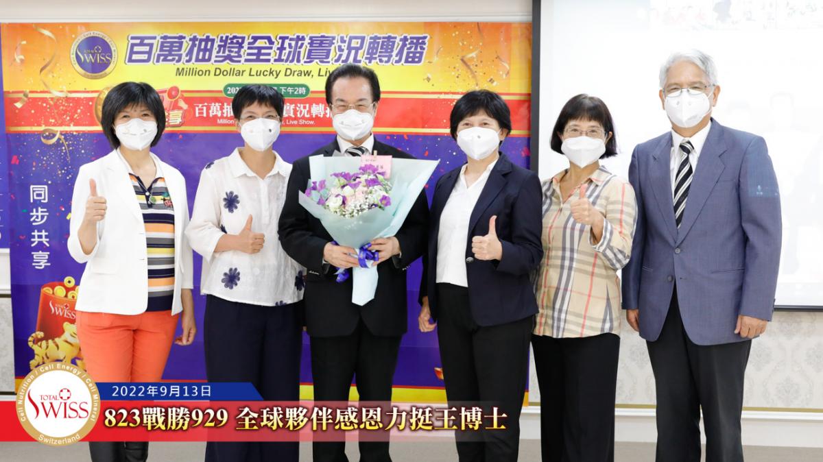 隨後,在台北現場的各事業團隊,包括星光團隊、冠軍團隊、領袖團隊等依序上台向王博士獻花致意,感謝他用無比的意志奮戰到底,為公司贏得勝訴的勝利。