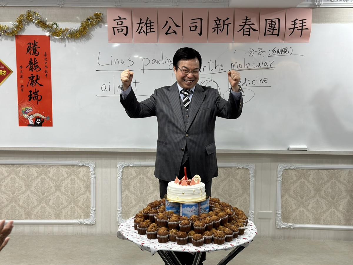 隨後,王博士啟動了龍年新春團拜行程,首站是2月17日高雄的新春團拜,一百多位高雄地區的夥伴齊聚四維三路高雄公司,與王博士一起迎接龍年的好運勢,活動中,黃韻甄總裁、余美貴總監帶動全場舞動青春,一開場就讓活動火熱起來。