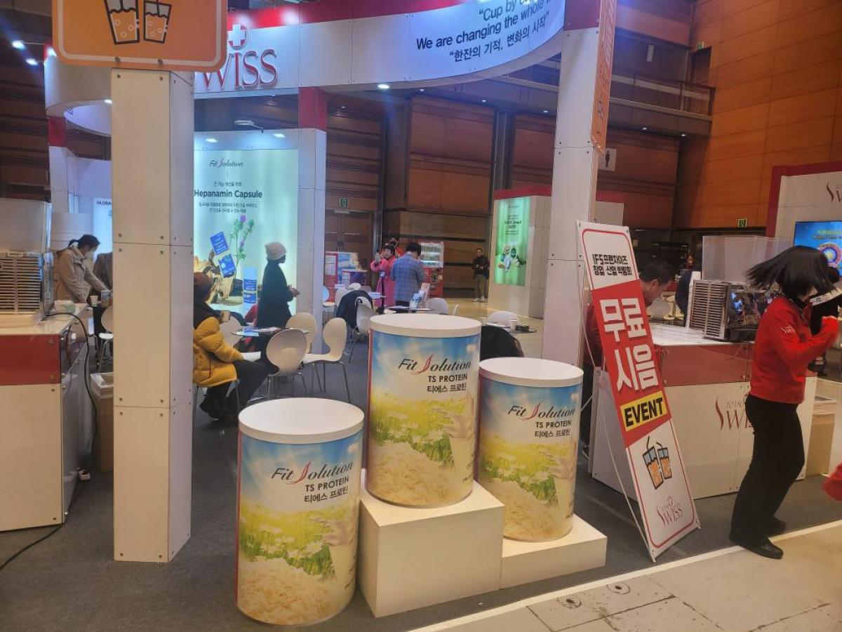 一如Total Swiss每一次參展都能一鳴驚人、撼動全場的傳統一樣,這一場首爾COEX國際連鎖加盟展,Total Swiss的壯闊攤位(總計使用了16個攤位)與獨特風格,早在還沒開展之前的籌備期就十分引人矚目,廣闊的展位線條優美,加上三冠王、素蛋白、利保肝的醒目仿真大型立牌,在展場中形成了一種讓人不得不多看一眼、不得不想要走近一探究竟的吸引力。