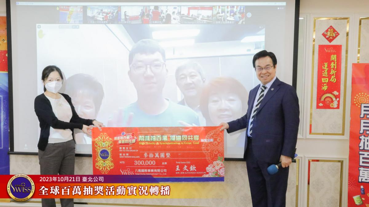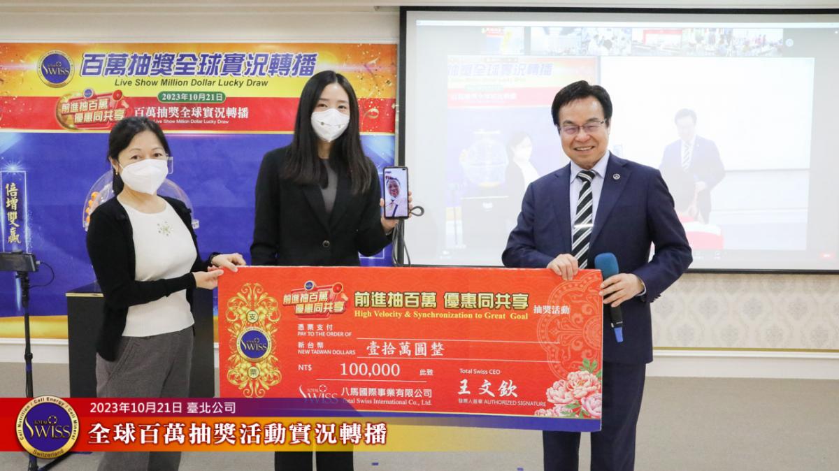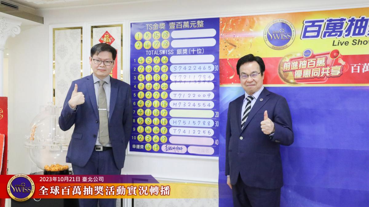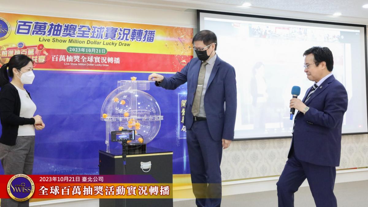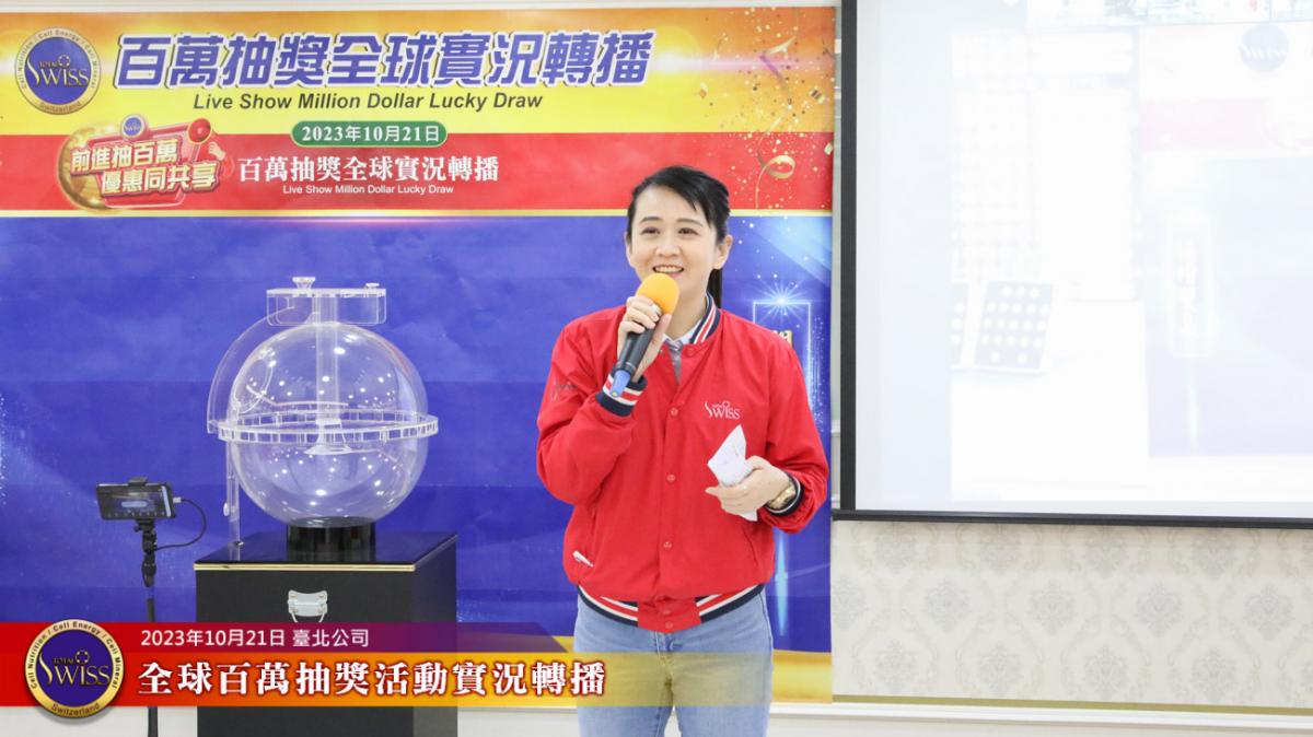 2023年10月21日中午12點30分,第22回Total Swiss百萬抽獎全球實況在台北公司七樓舉行,這一次抽獎活動,較往常提前了一個小時,並且順序對調,先進行抽獎,再接著王博士的健康講座。另外,由於前21回百萬抽獎當家主持人阮錦威總裁正在大陸發展組織,第22回抽獎活動也由Ivy副總暫代主持。