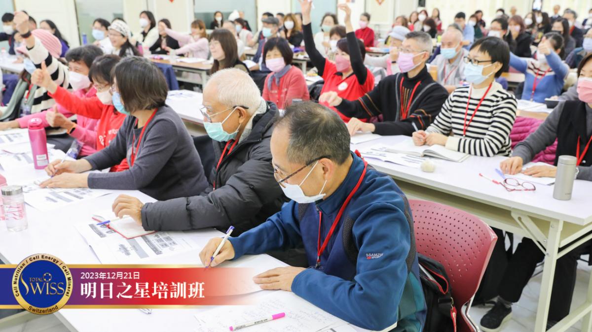 12月21日,在2023年度首波寒流的低溫中,Total Swiss在台北公司七樓舉辦「明日之星培訓班課程」,近百位學員有人來自台東、有人來自南投山上,甚至遠道從炎熱的馬來西亞專程飛來學習。同時,在課堂的後場,還有數十位皇冠總裁、總裁及上線推薦人陪同一起學習。