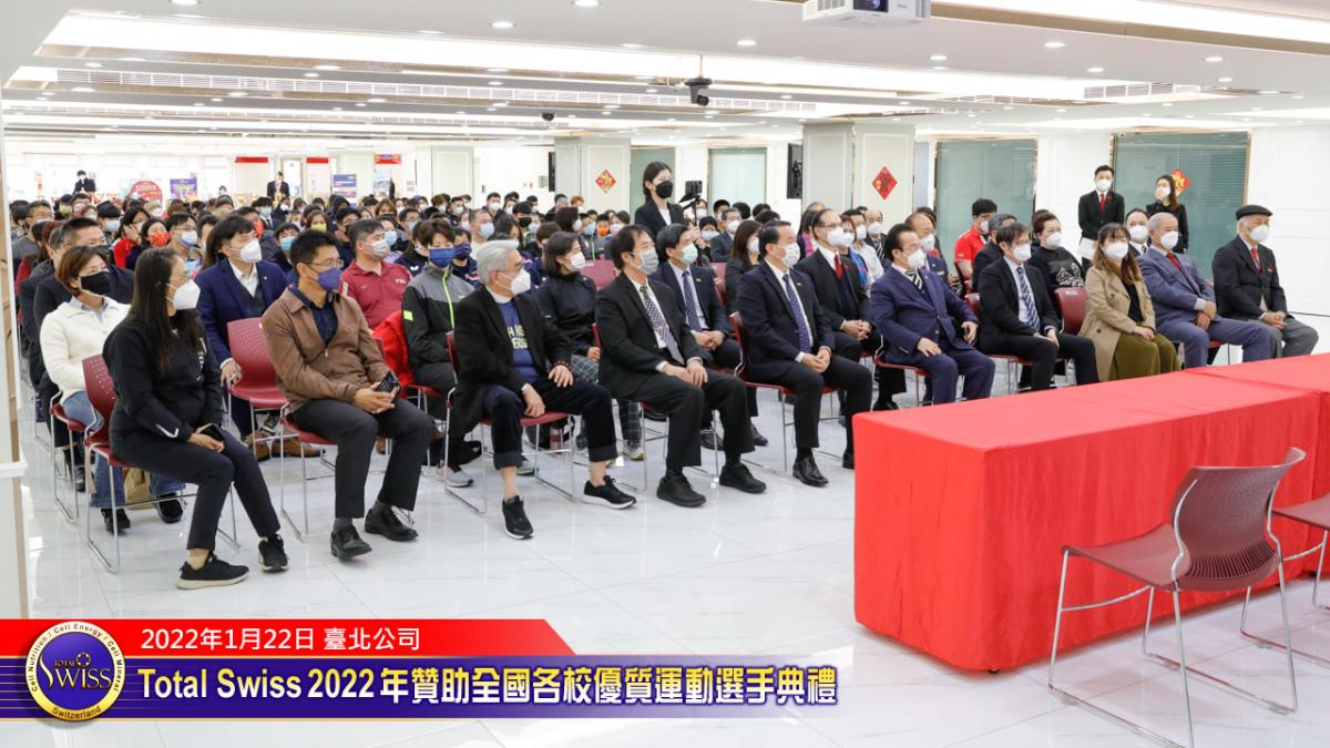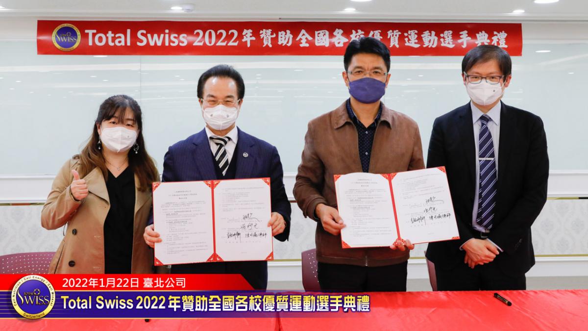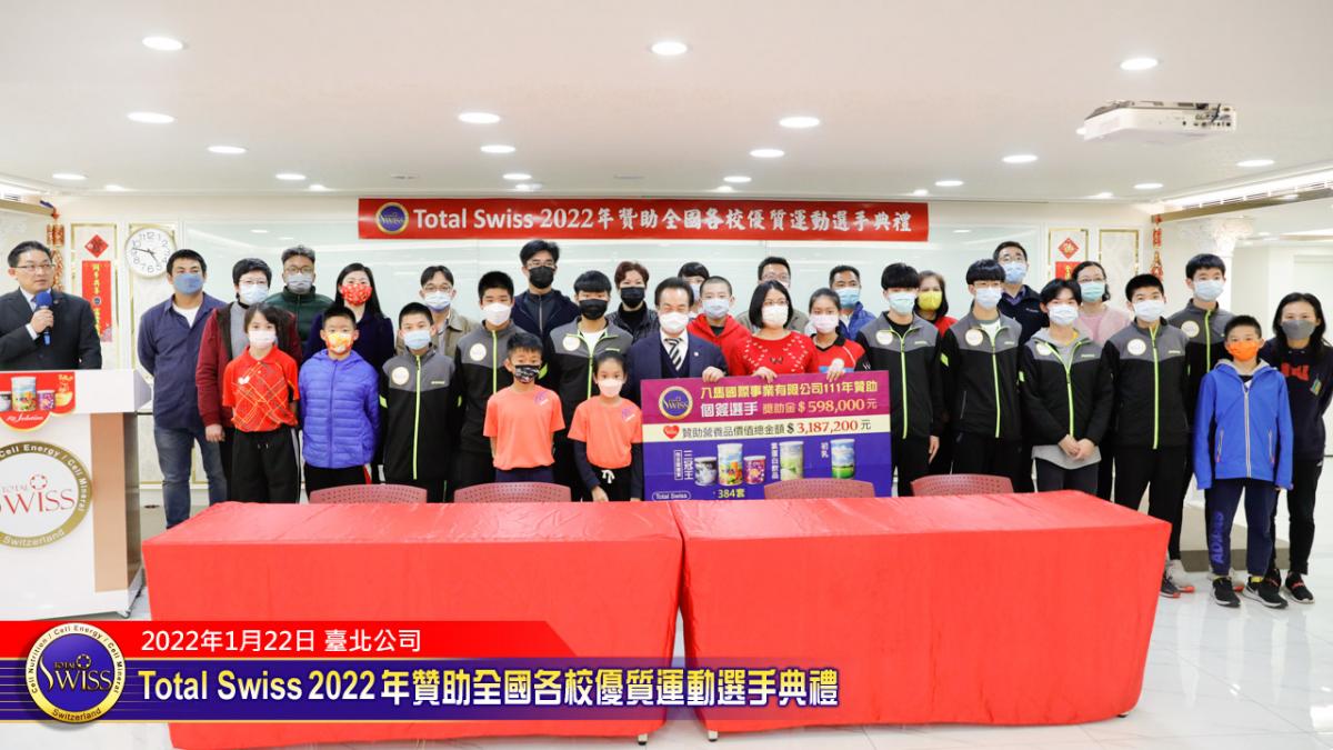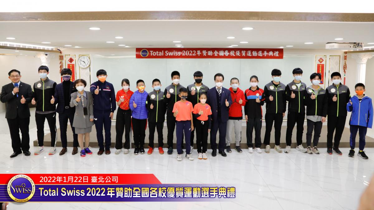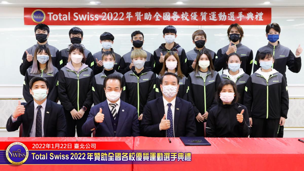 2022年1月22日下午,Total Swiss 2022年贊助全國各校優質選手典禮在Total Swiss在台北公司七樓舉行,包括國立體育大學、臺北市立大學、私立世新大學、台中富春國小、台南信義國小等受贈學校,莫不組成浩大的隊伍到場參加並且展現出運動員特有的活力與朝氣,使得這一場原本極為簡單的贊助儀式有了生動活潑的氣氛,也讓人感受到活動背後的深遠意義。