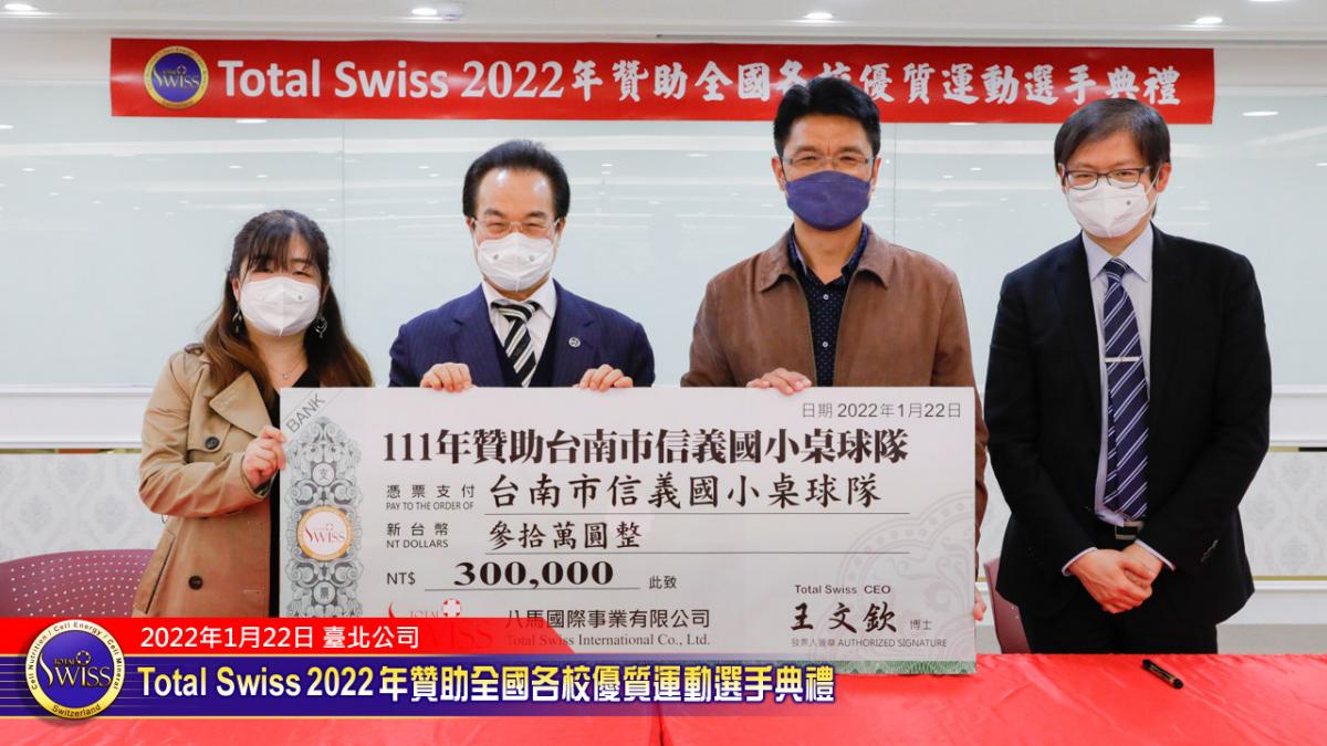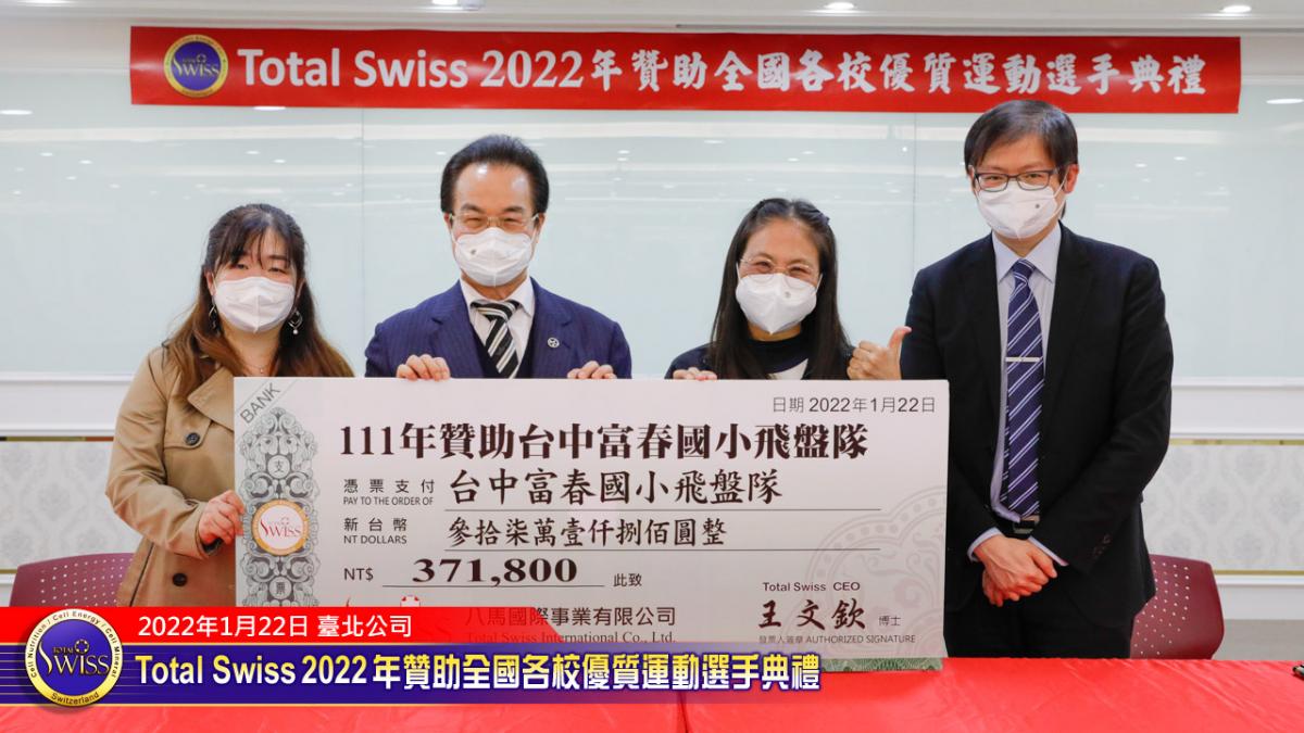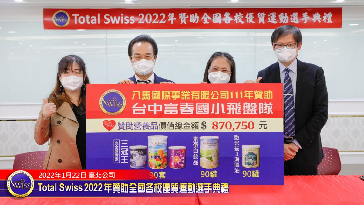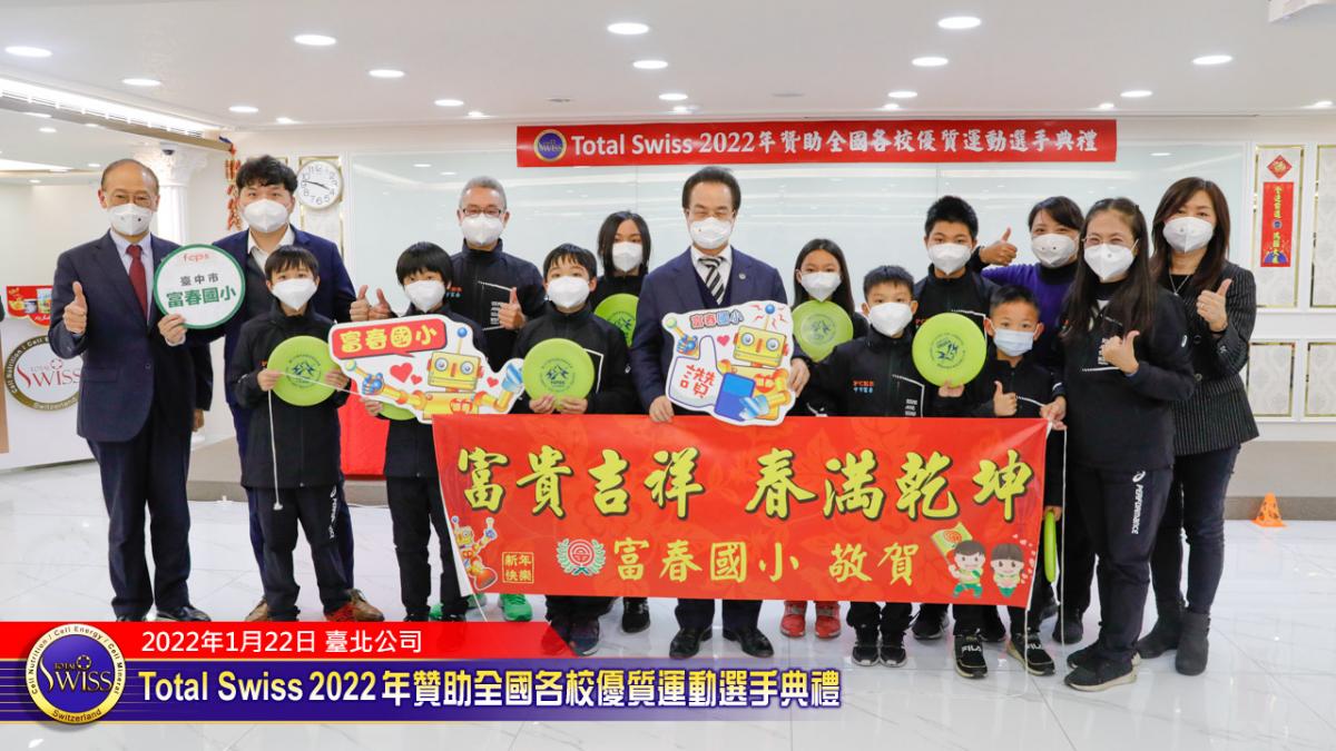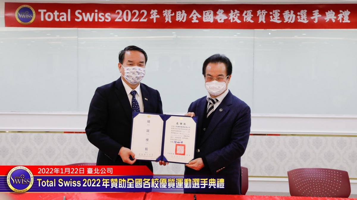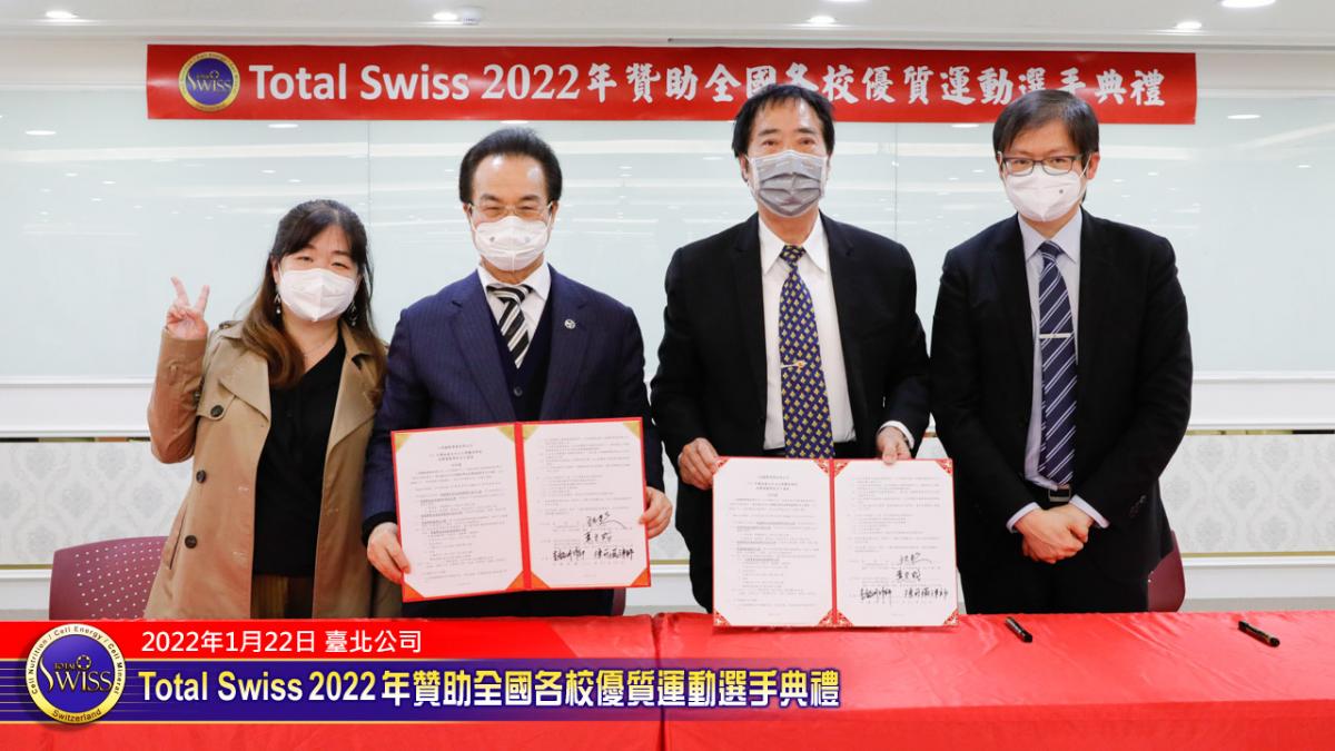 2022年1月22日下午,Total Swiss 2022年贊助全國各校優質選手典禮在Total Swiss在台北公司七樓舉行,包括國立體育大學、臺北市立大學、私立世新大學、台中富春國小、台南信義國小等受贈學校,莫不組成浩大的隊伍到場參加並且展現出運動員特有的活力與朝氣,使得這一場原本極為簡單的贊助儀式有了生動活潑的氣氛,也讓人感受到活動背後的深遠意義。