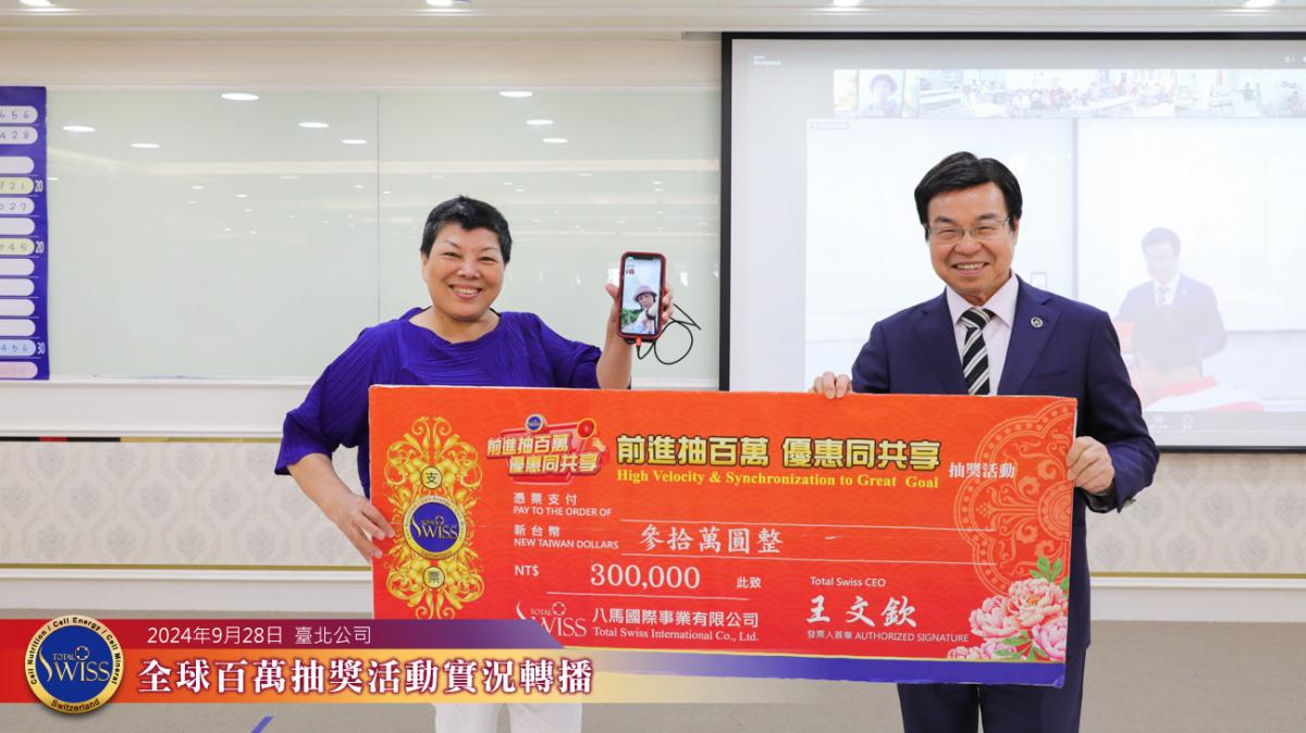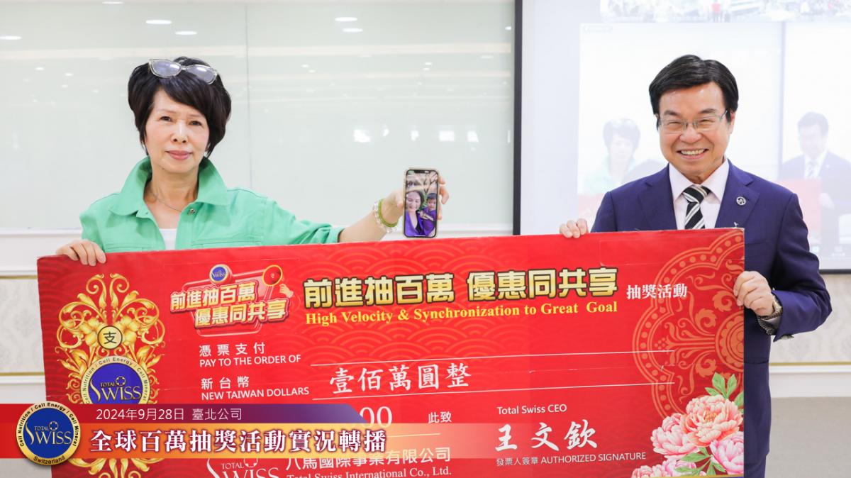 另一位百萬得獎人則是周朝瑞總裁底下一位剛剛加入沒多久的下線,王博士也藉此強調,連新人都可以中一百萬,Total Swiss的抽獎是最公平的,他鼓勵大家說:「不要擔心Total Swiss百萬抽獎會停止,大家要盡量把一帶五往下延伸下去。」