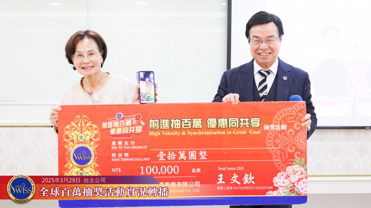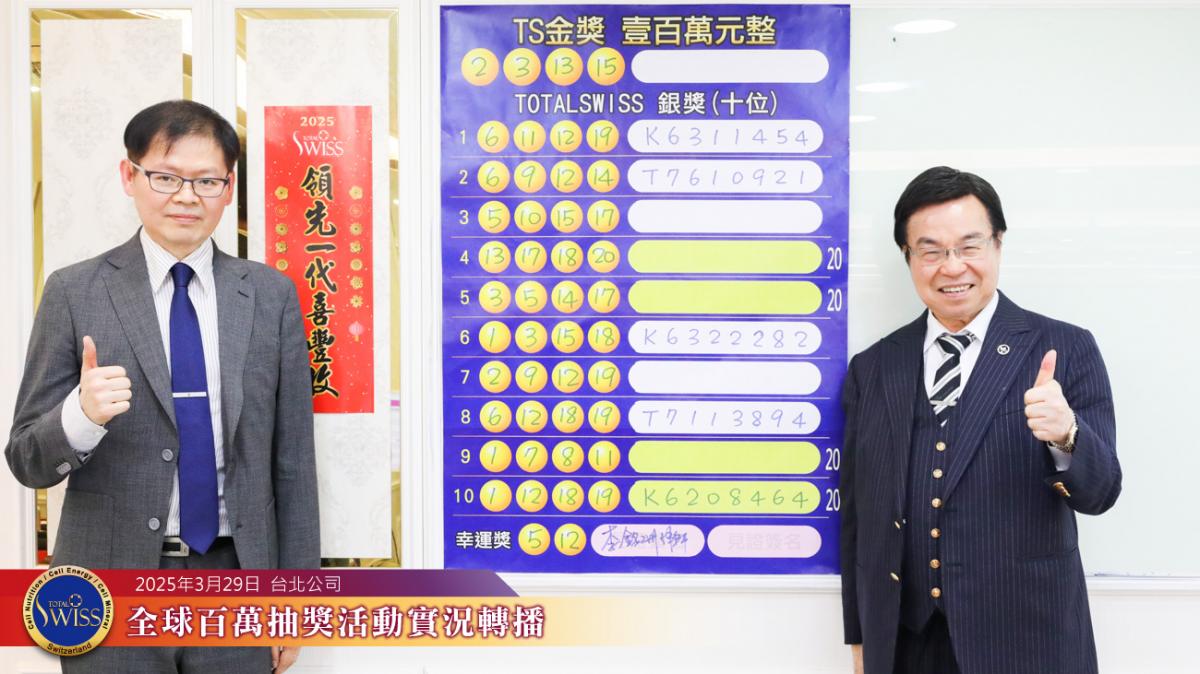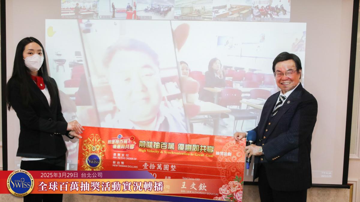 2025年3月29日下午,Total Swiss第39回百萬抽獎在台北公司七樓舉行。全台分公司、藥妝藥局以及全球各據點也透過線上轉播讓全球夥伴可以同步參與。
