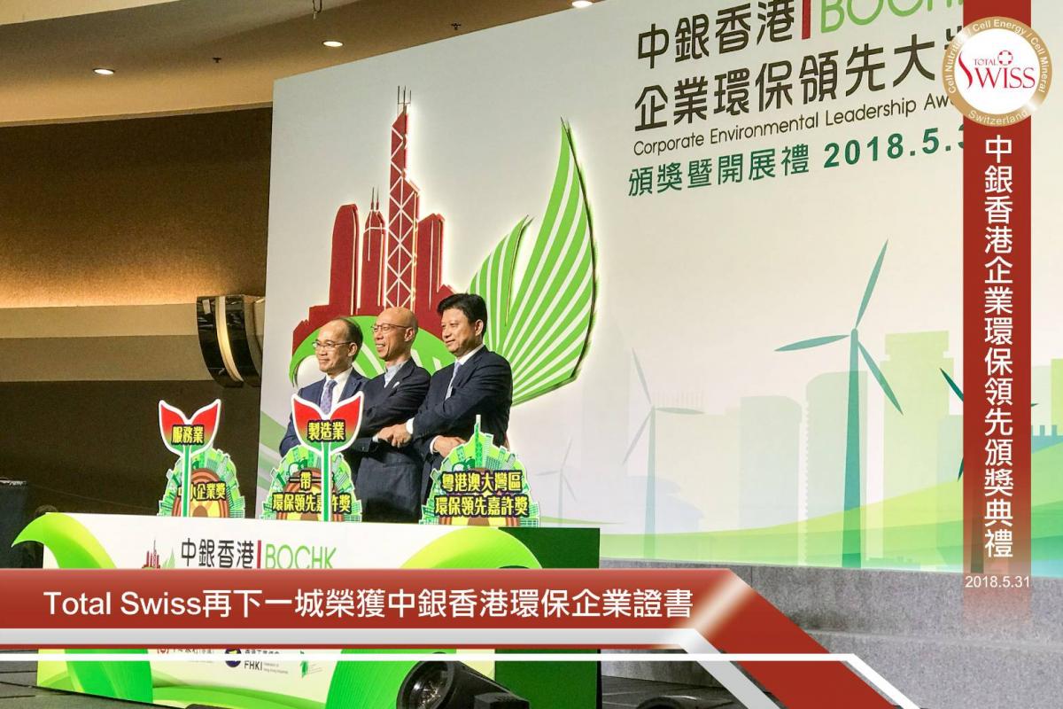 繼2015年榮獲聯合國世界綠色組織頒發綠色辦公室(Green Office)榮譽後,Total Swiss於2018年再度榮獲環保大獎,獲頒中國銀行(香港)和香港工業總會聯合舉辦的「中銀香港企業環保領先大獎-環保優秀企業證書」。