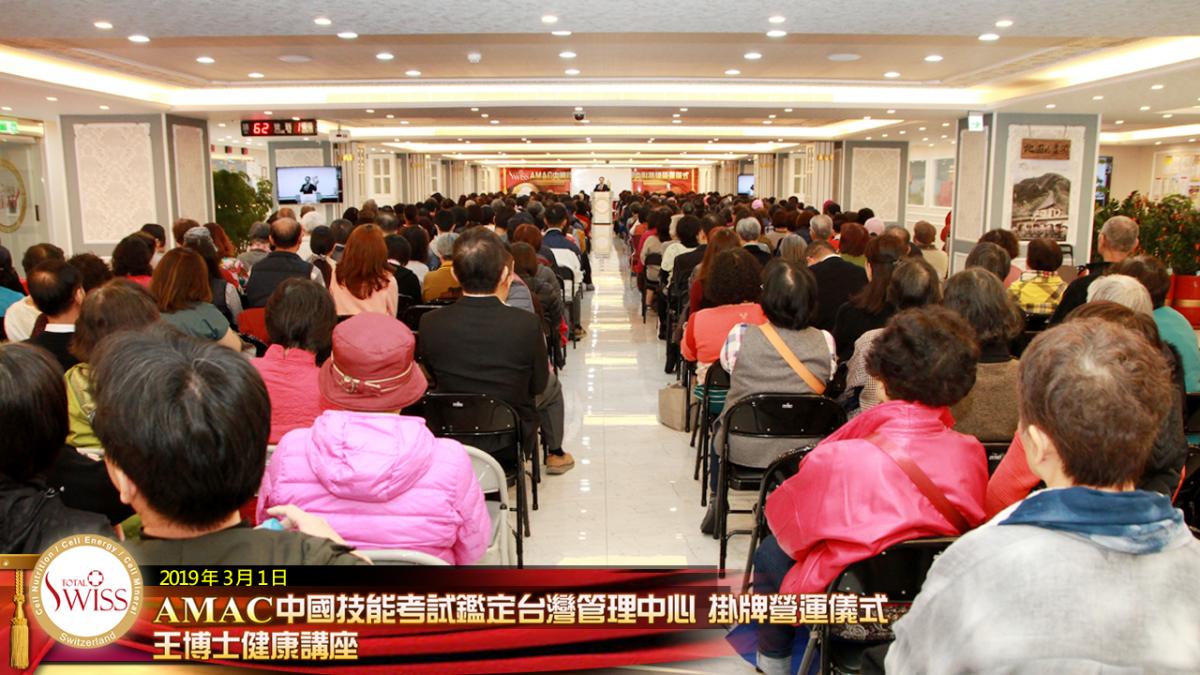 經過一個多月奔忙,Total Swiss全球創辦人王文欽博士在新加坡主持AMAC掛牌揭幕儀式及第12場健康講座之後,2019年3月1日,王博士回到台灣,於台北公司舉行AMAC掛牌揭幕及健康講座。