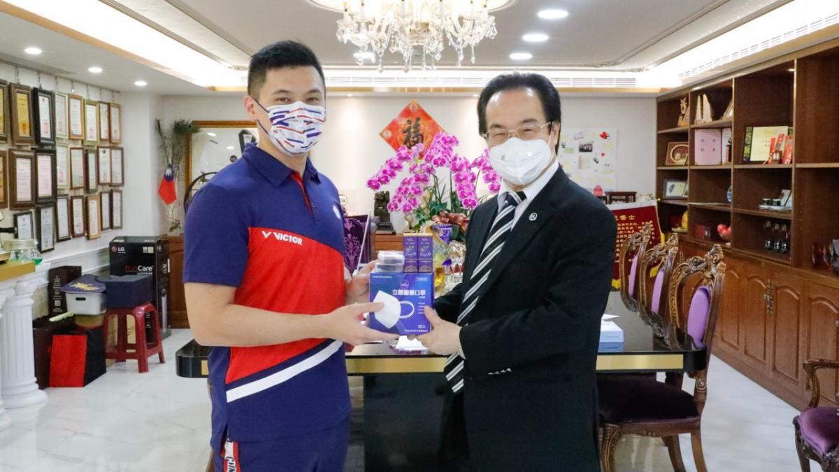 會晤最後,王翌達將一株精美的奧運紀念樹贈送給王博士,而王博士也把最近火熱的Cover19防疫精油套組送給了王翌達跟教練。