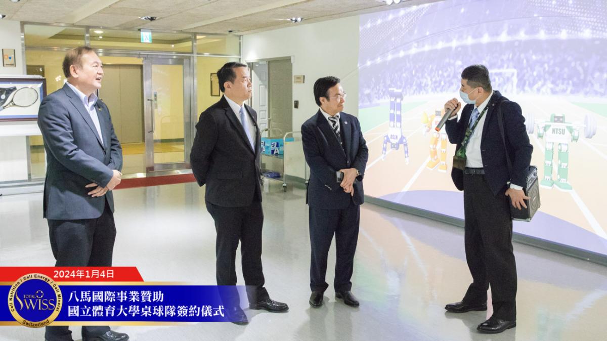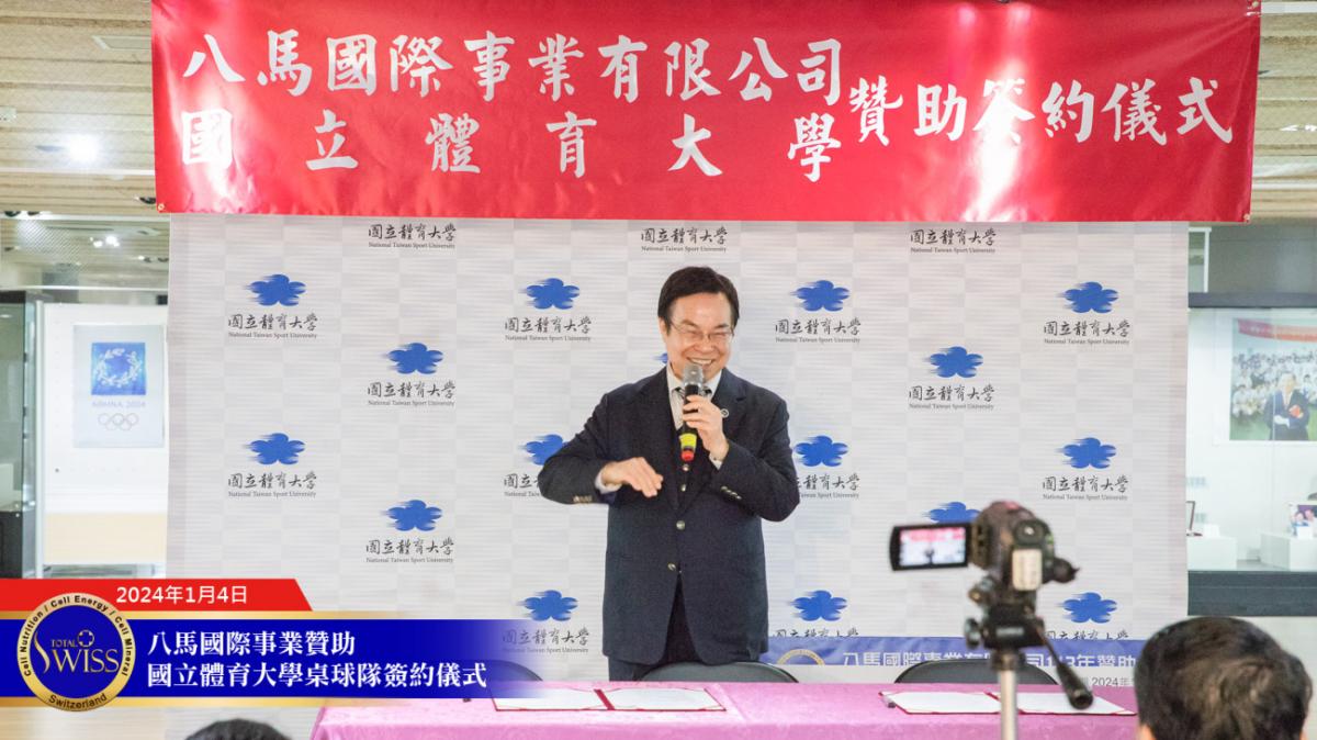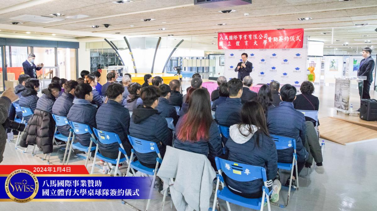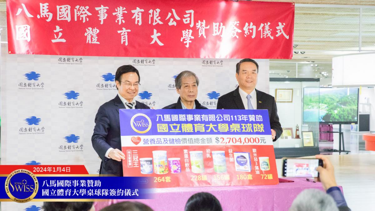 2024年1月4日上午10點,Total Swiss八馬國際事業贊助國立體育大學簽約儀式於國立體育大學體育與圖書博物館成果展區舉行。