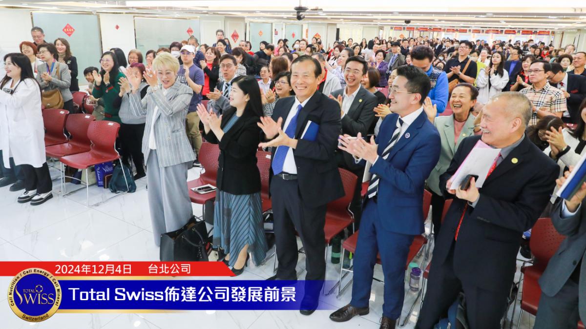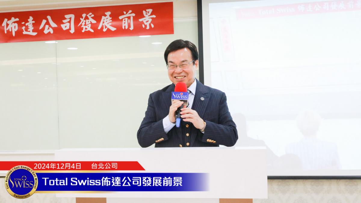 2024年Total Swiss全球頒聘大會於12月4日正式揭開序幕,下午1點30分,在張在心副總、孫守德總裁的引言之後,王博士向齊聚Total Swiss台北公司七樓跟二樓,來自全球16個市場的一千多位領導人,詳細闡述了別人想學也學不來,想追也追不上的未來五年六大願景。