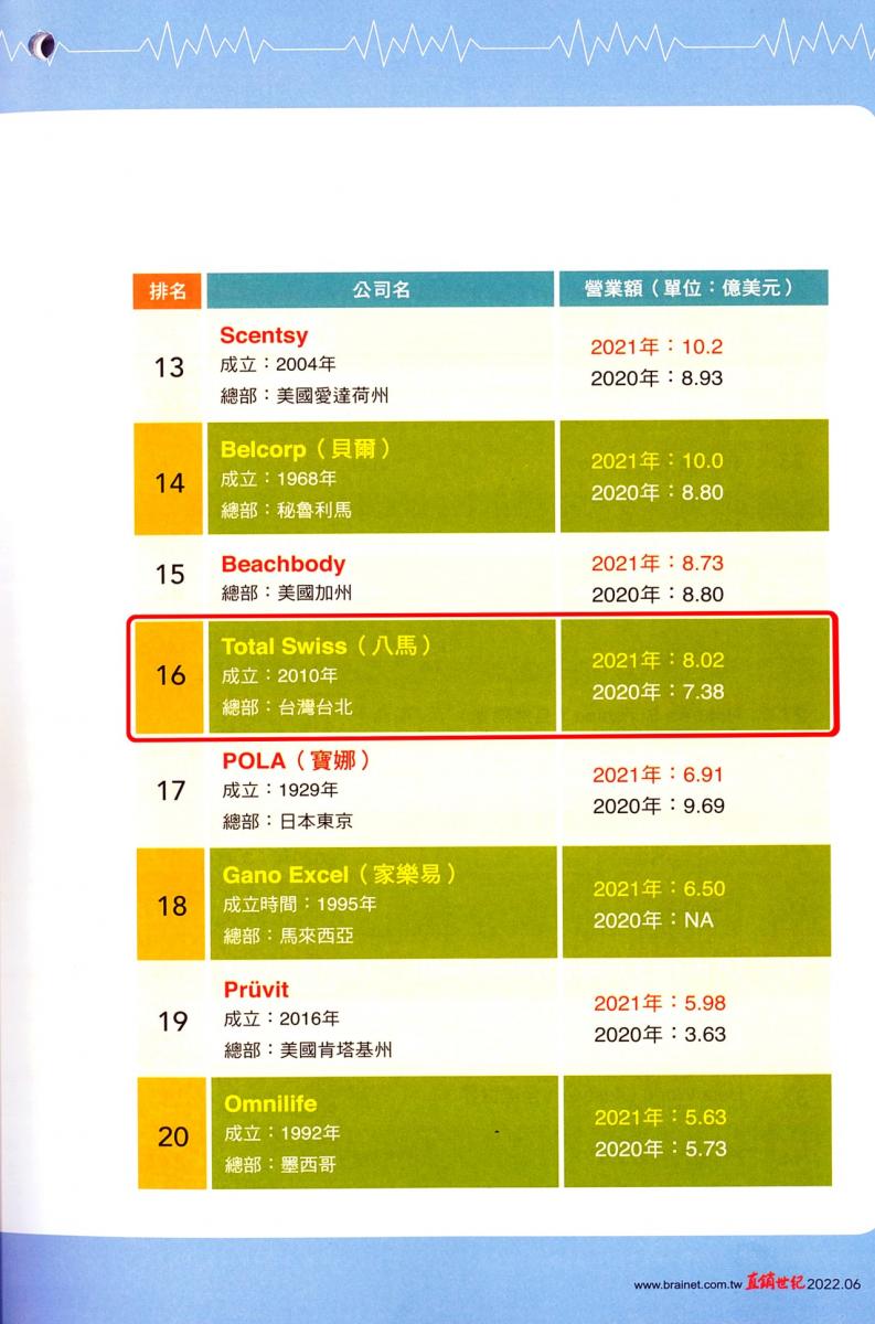 現在,2022年6月號直銷世紀的《2021年全球一百大直銷公司風雲榜》已經正式出爐,Total Swiss全球16個市場的2021年營業總額為8.02億美元,榮登全球百大第十六名,較2019年的第19名再度向前挺進三名。