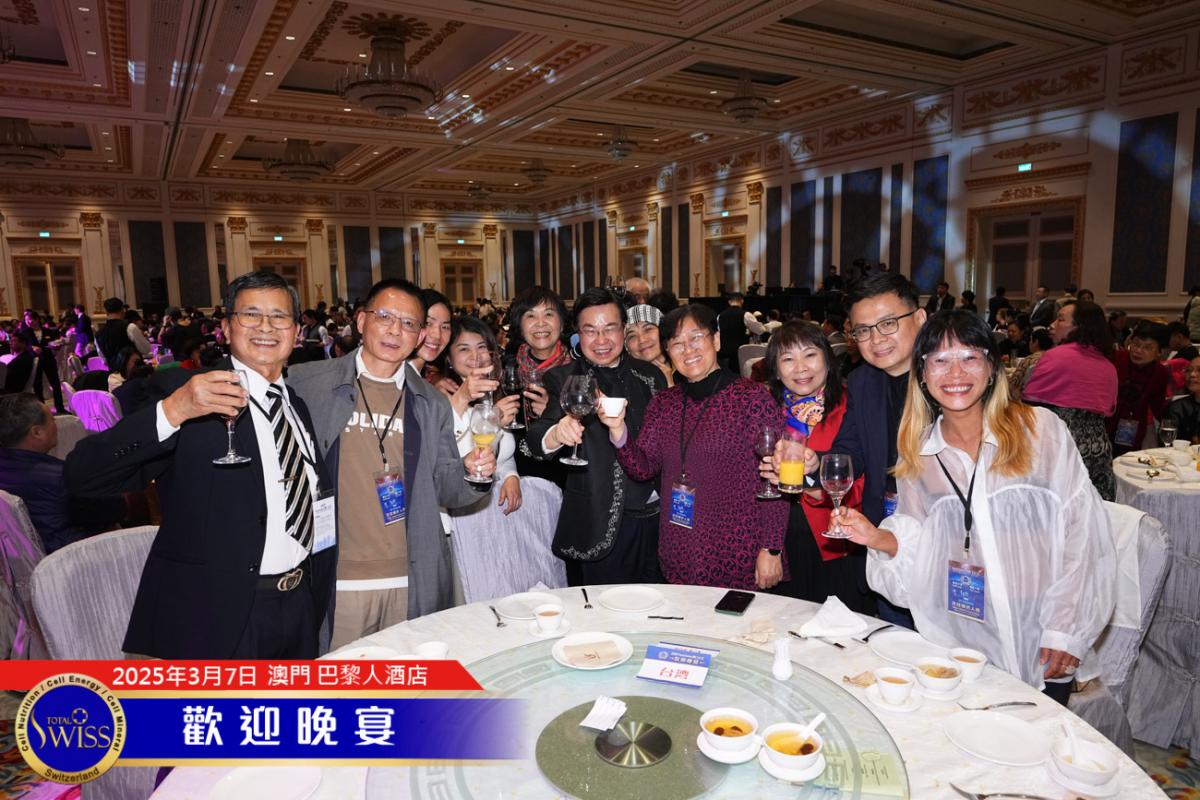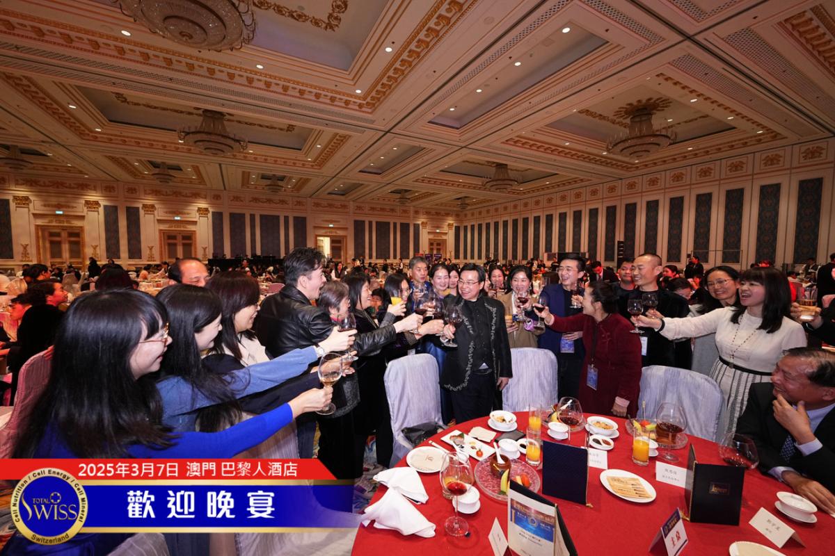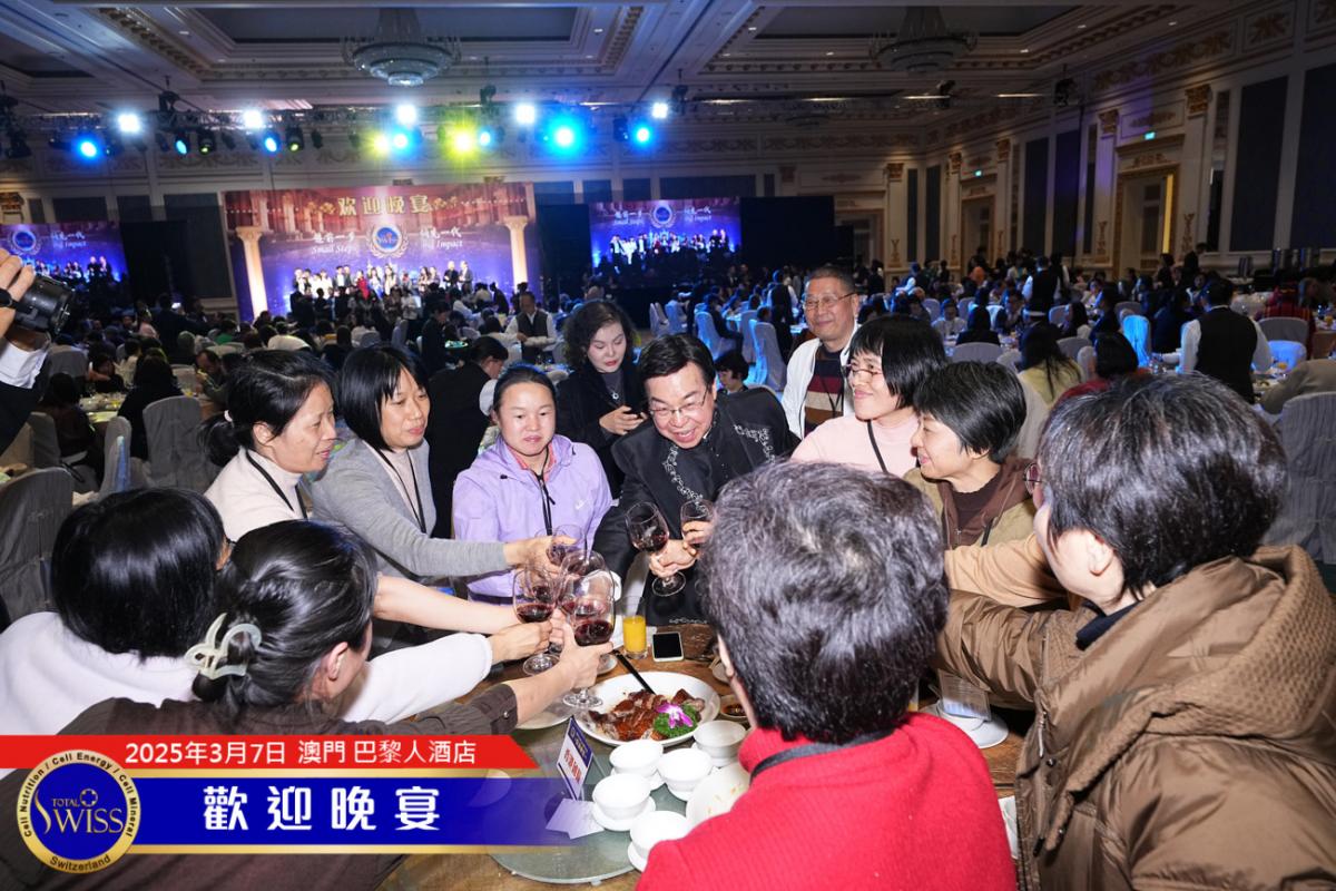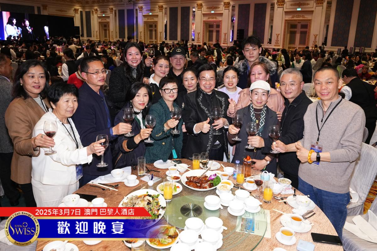 經過了台灣行政的用心籌畫以及大陸行政的全力支援,2025 Total Swiss澳門大會第一個重要活動,也可以稱為整個系列活動的序幕「巴黎人歡迎晚宴」於3月7日晚間舉行,七百多位來自大陸、菲律賓、新加坡、馬來西亞、印尼、韓國、日本、香港、台灣及澳洲的夥伴陸續入席之後,王博士於晚間六點半左右向全場家人舉杯,宣布晚宴正式開始。