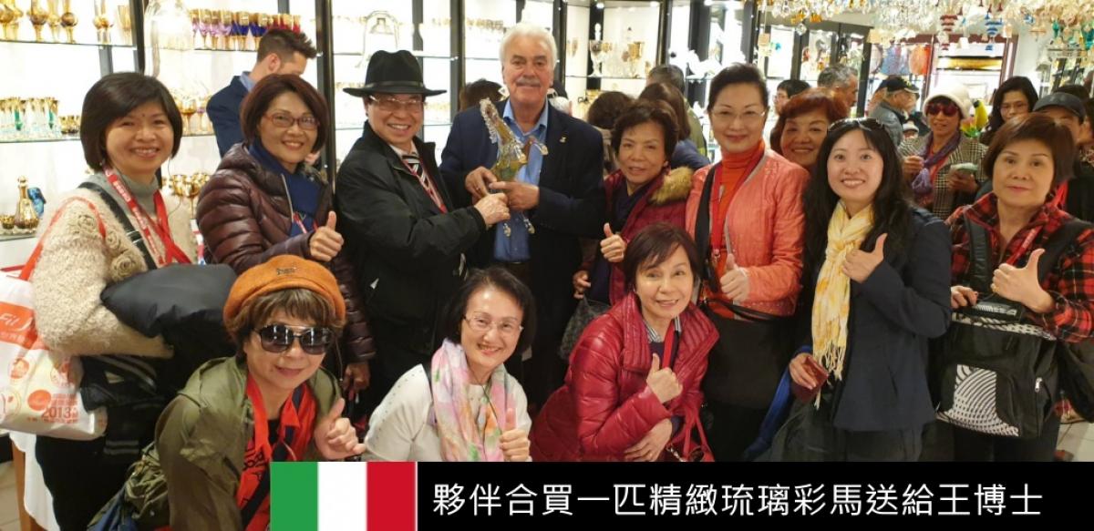 一般人不喜歡在旅遊行程中被強制購物,但如果購物是一種主動的期待,那麼情況就會完全不同。 早在佛羅倫斯的時候,許多夥伴已經躍躍欲試,用鷹一樣的銳利目光逡巡著義大利紀念好物。 在耐心欣賞一千多度高溫燒製玻璃的表演之後,夥伴們於是紛紛大方的把晶瑩剔透的戰利品收入行囊之中。 當然,大家也沒忘記王博士,一起把現場最漂亮的那一匹琉璃彩馬買下來送給王博士。