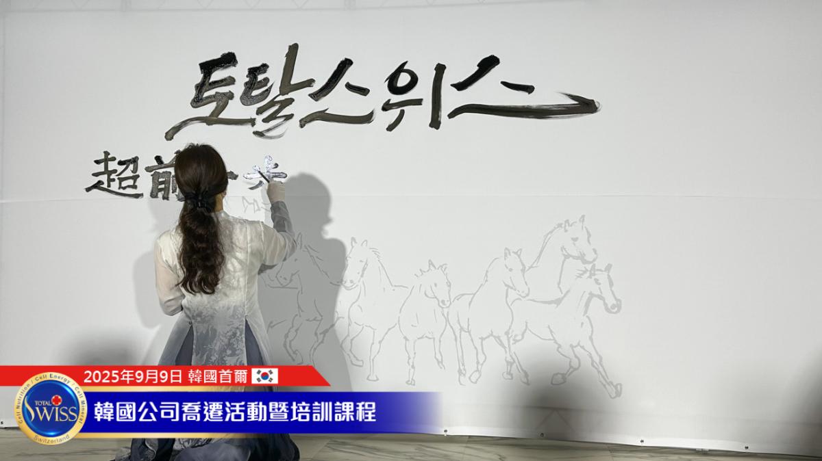 然後,林多仁邀請韓國書法藝術 Mentoring 協會會長李花善登台進行現場揮毫,他用韓文書法寫出大大的Total Swiss,用中文寫出超前一步、領先一代,再畫出八匹奔騰的駿馬,象徵八馬國際馳騁全球。