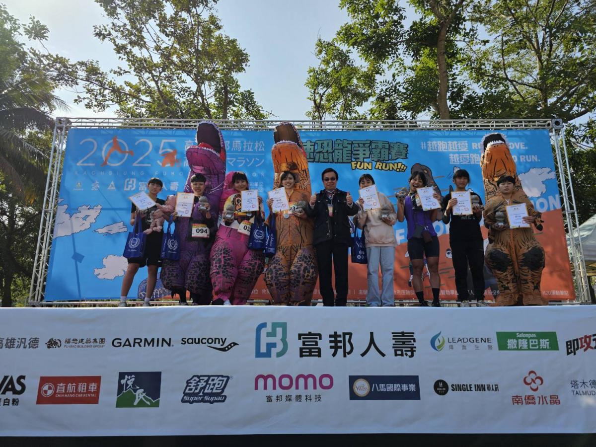 兩天的比賽,活動首日由3公里休閒組打頭陣,緊接著最速恐龍爭霸賽於高雄國家體育場戶外草皮舉行。王博士也趕了大早,來到國家體育場戶外草皮,跟著貴賓、選手們一起參與、一起搖擺,用親身的參與展現對運動員的支持。