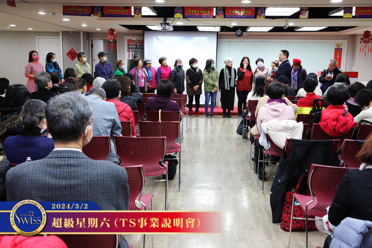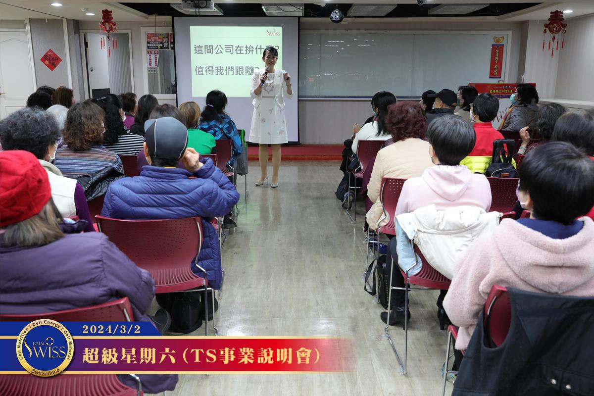 首場超級星期六於3月2日下午兩點在台北公司四樓教室正式登場,課程由在將官班、特訓班受到肯定的Johnny老師以及在Total Swiss任職九年,深諳Total Swiss核心優勢與王博士想法的Ivy副總搭配擔綱,現場共有114位夥伴新人參加,另外還有許多總裁、皇冠總裁前來陪同。