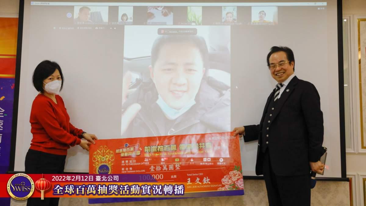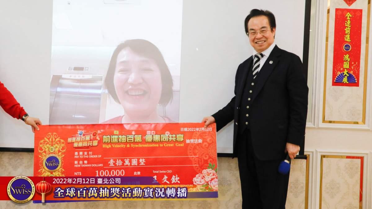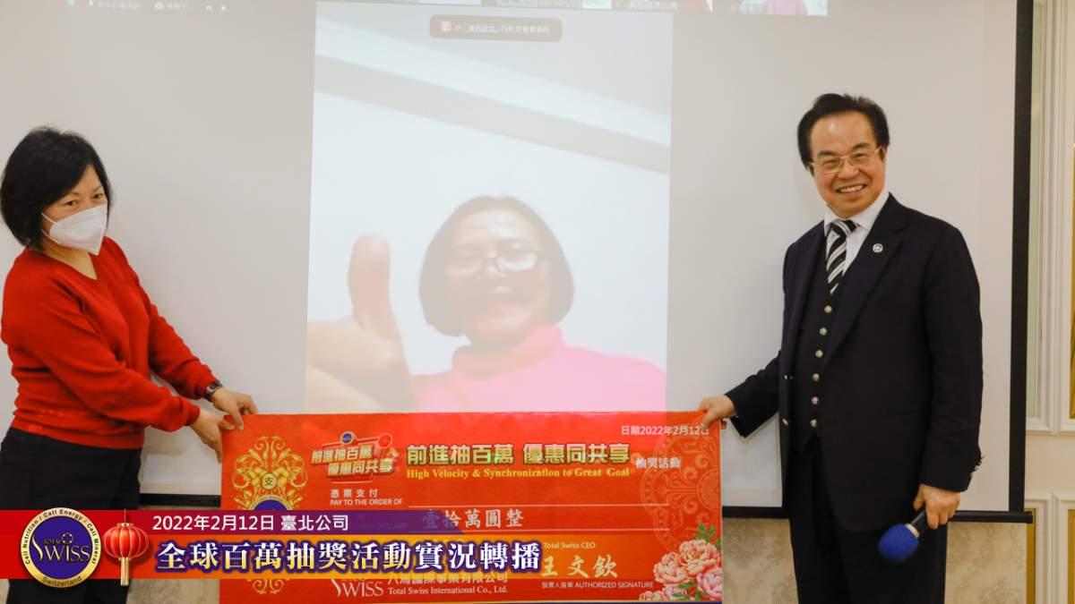 2月12日下午,百萬大抽獎活動於Total Swiss台北公司七樓舉行,除了到場的北部夥伴情緒緊張、心跳加速之外,透過視訊系統參加活動的全球夥伴也十分踴躍,每個人都希望一百萬元的大獎能夠落到自己的頭上。