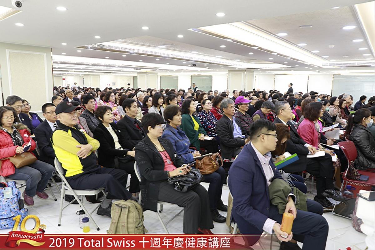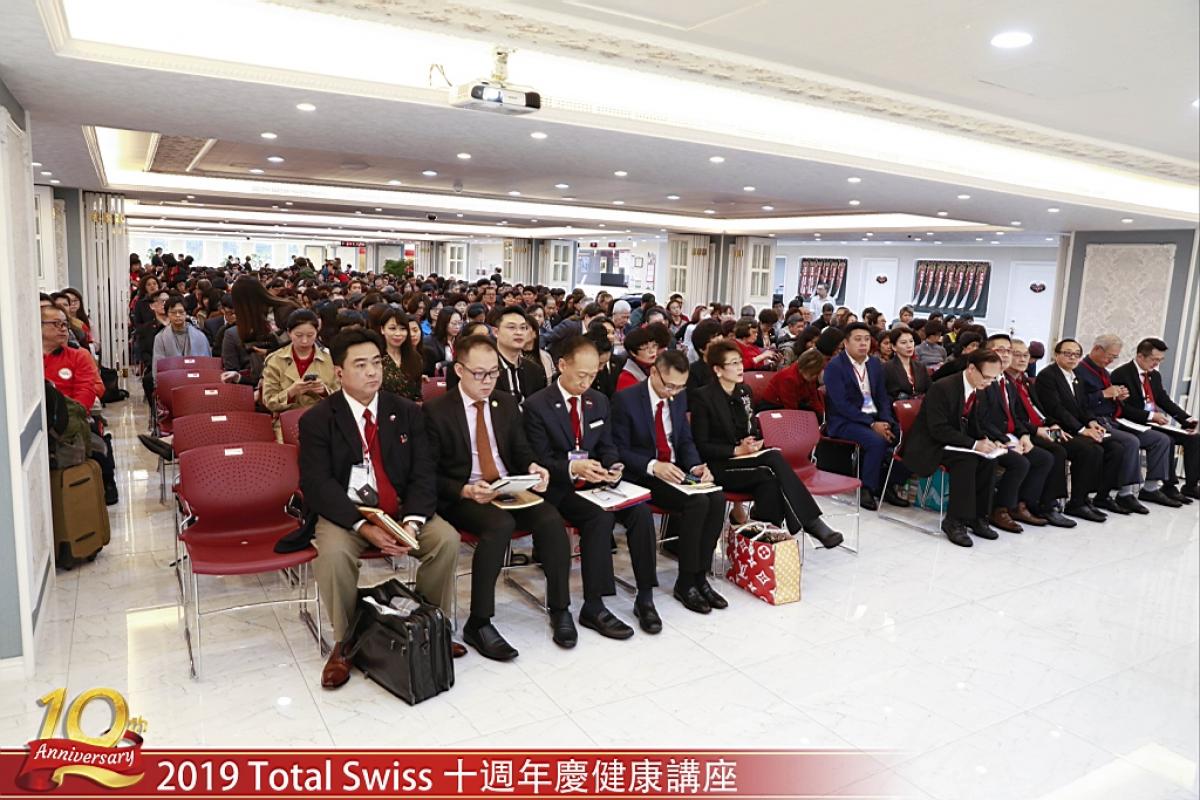 Total Swiss十周年年會暨2019頒聘大會第二天,2019年12月13日,王博士在Total Swiss台北辦公室二樓舉辦健康講座。由於人數眾多,二樓大辦公室席位保留給海外回來的夥伴,台灣本地夥伴則透過同步視訊,...