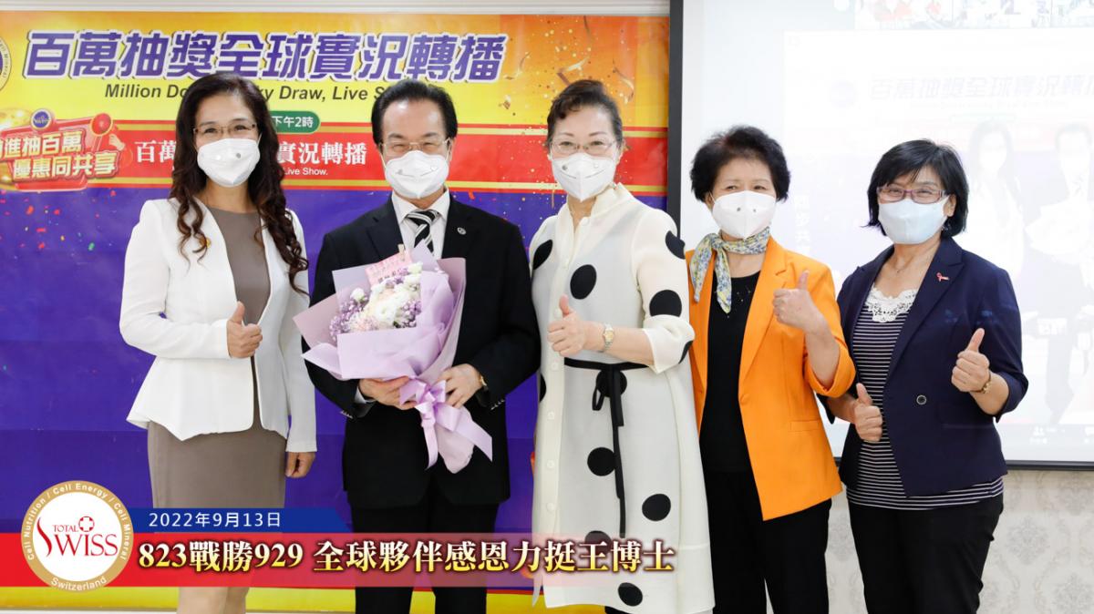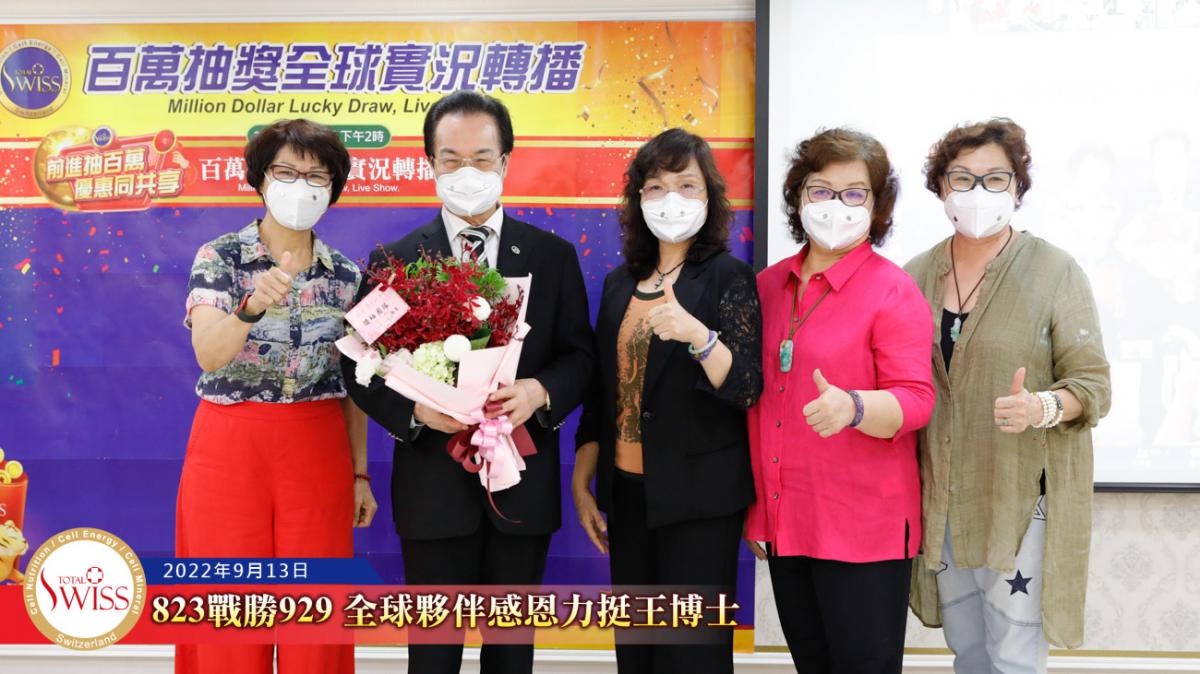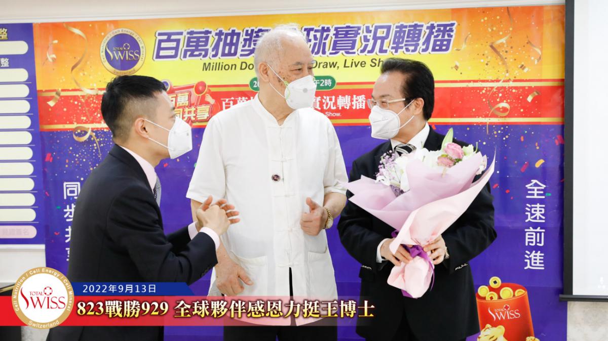 隨後,在台北現場的各事業團隊,包括星光團隊、冠軍團隊、領袖團隊等依序上台向王博士獻花致意,感謝他用無比的意志奮戰到底,為公司贏得勝訴的勝利。