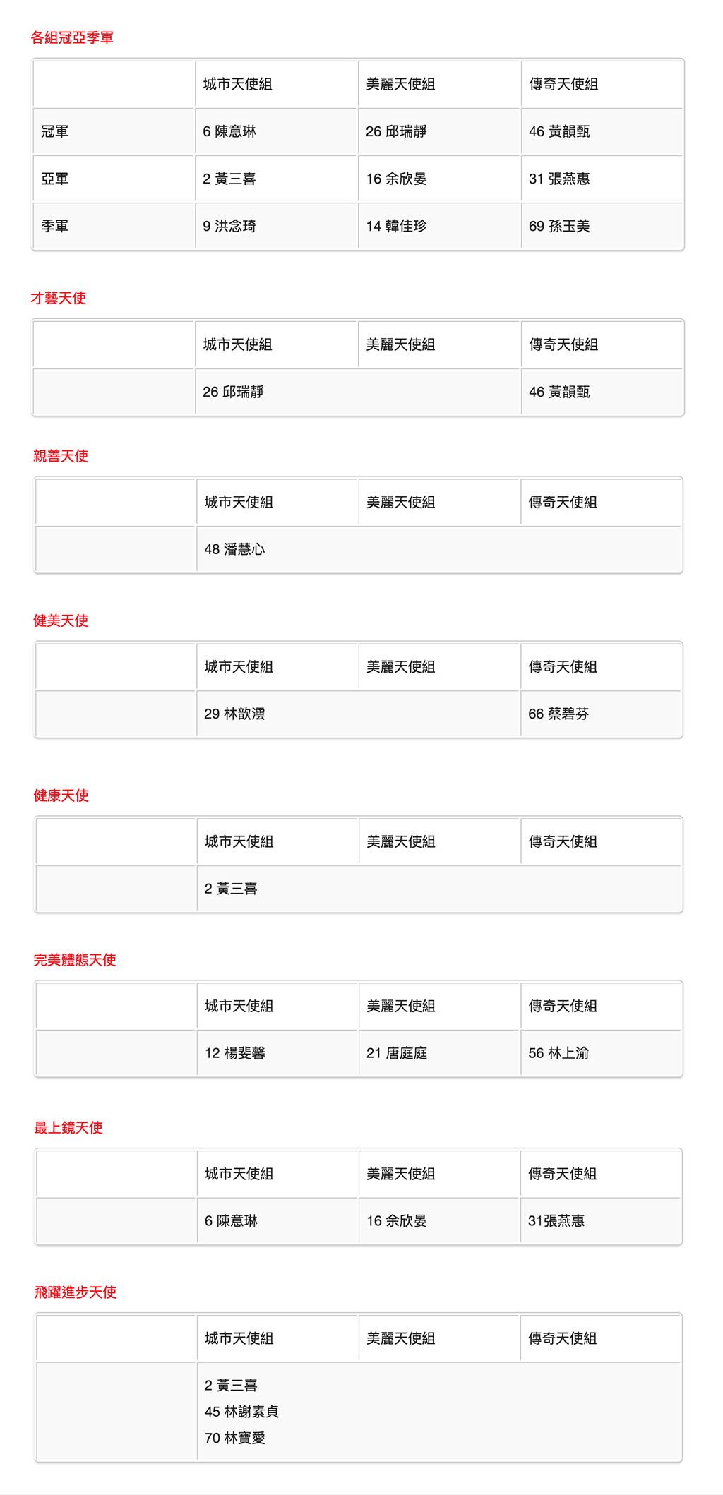 在本屆選拔過程中,隱隱中號碼中有六的佳麗似乎注定要成為贏家。城市天使組后冠,由六號佳麗陳意琳奪得;美麗天使組后冠,由二十六號佳麗邱瑞靜獲得;傳奇天使組后冠,由四十六號佳麗黃韻甄拿下。