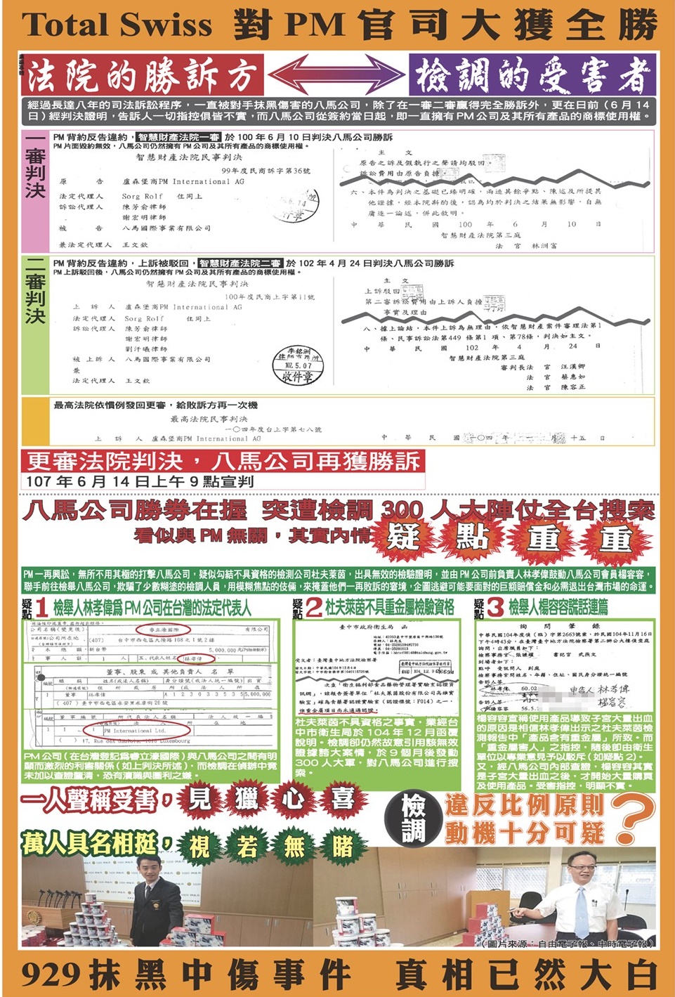 2018年6月18日及20日,Total Swiss在蘋果日報與自由時報刊登全版廣告,用四個司法判決、三大檢調疑點,向社會大眾公開披露Total Swiss官司全勝卻遭受檢調抹黑中傷的真相。 同時,我們合理懷疑並強烈譴責,檢調手握公權卻不當介入商業競爭的重大瑕疵。 檢調選擇性採證,「忽略關鍵證據而誇大無效證據」、「刻意打壓一方以圖利另一方」的辦案手法,疑雲重重、動機可議。