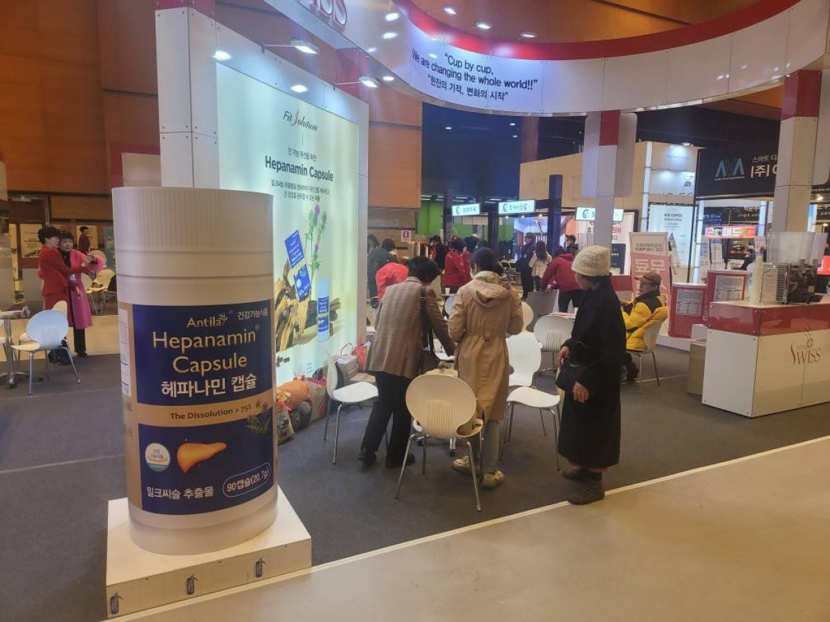一如Total Swiss每一次參展都能一鳴驚人、撼動全場的傳統一樣,這一場首爾COEX國際連鎖加盟展,Total Swiss的壯闊攤位(總計使用了16個攤位)與獨特風格,早在還沒開展之前的籌備期就十分引人矚目,廣闊的展位線條優美,加上三冠王、素蛋白、利保肝的醒目仿真大型立牌,在展場中形成了一種讓人不得不多看一眼、不得不想要走近一探究竟的吸引力。