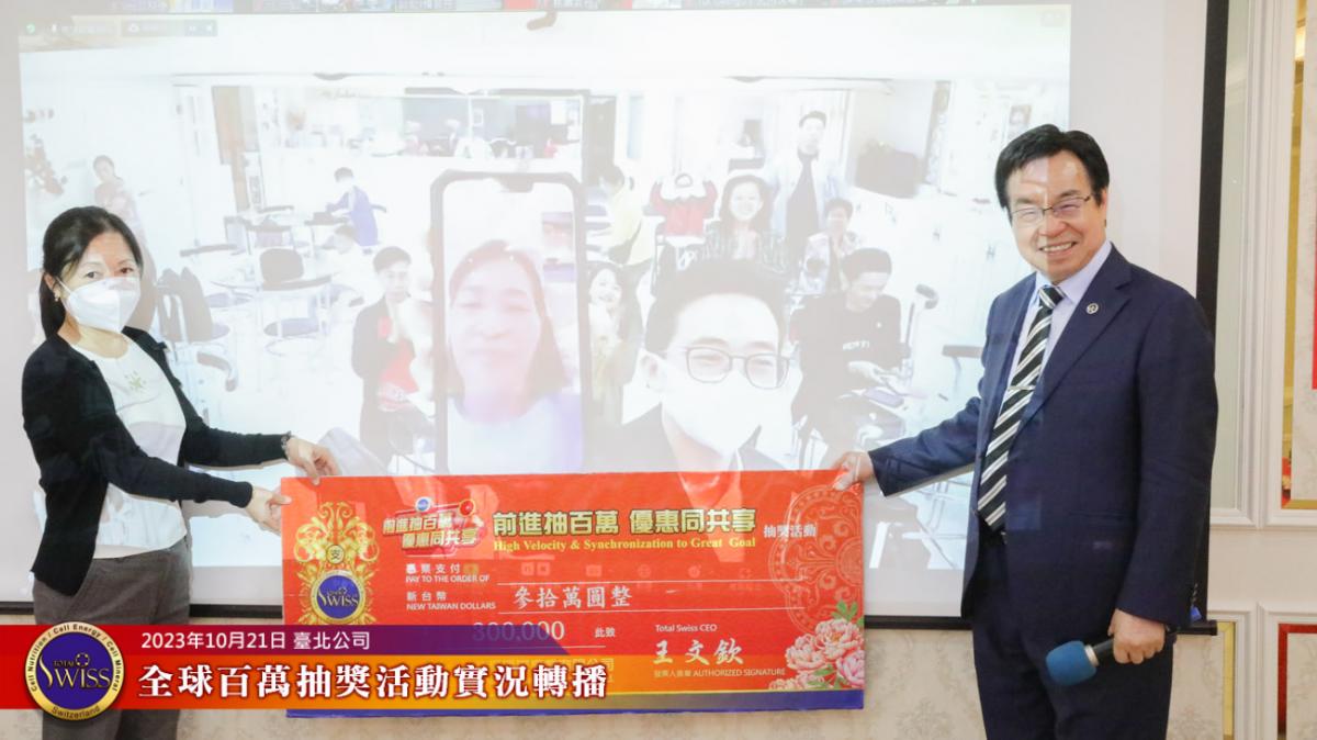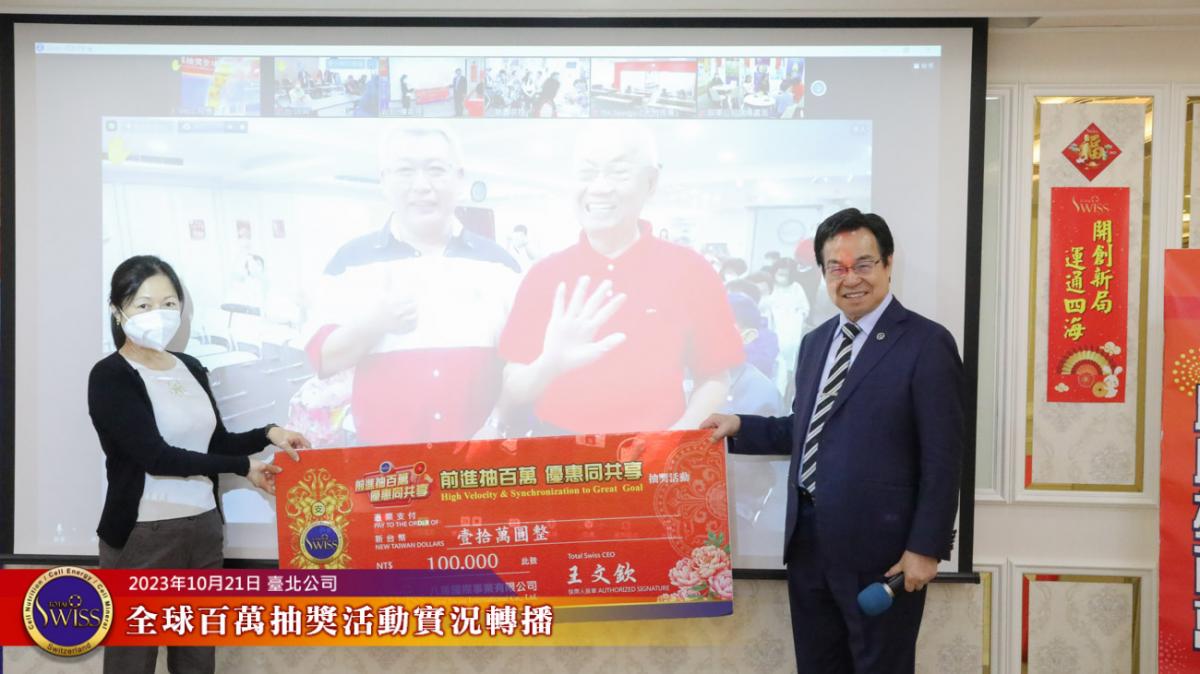 2023年10月21日中午12點30分,第22回Total Swiss百萬抽獎全球實況在台北公司七樓舉行,這一次抽獎活動,較往常提前了一個小時,並且順序對調,先進行抽獎,再接著王博士的健康講座。另外,由於前21回百萬抽獎當家主持人阮錦威總裁正在大陸發展組織,第22回抽獎活動也由Ivy副總暫代主持。