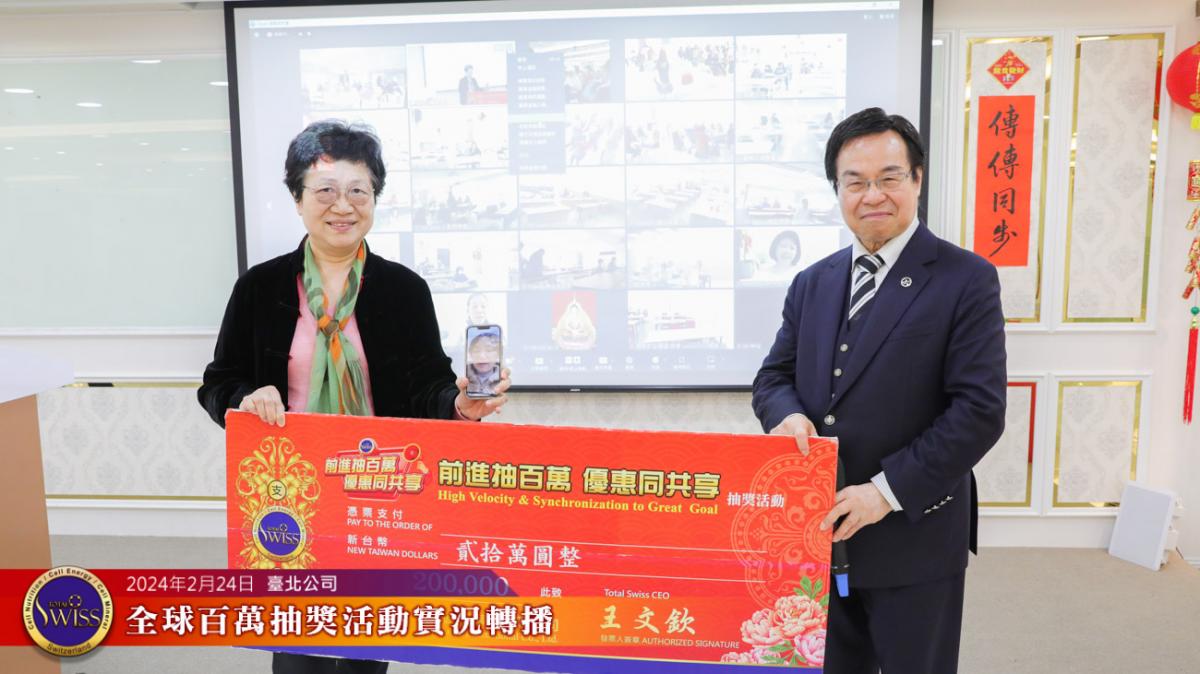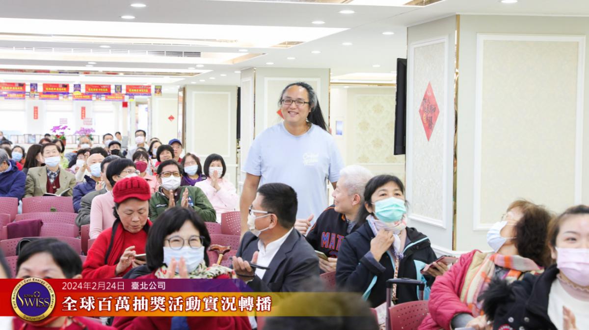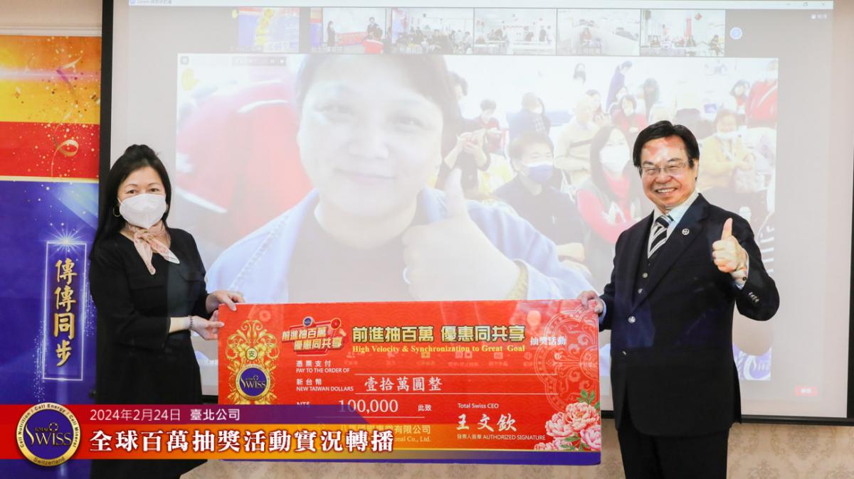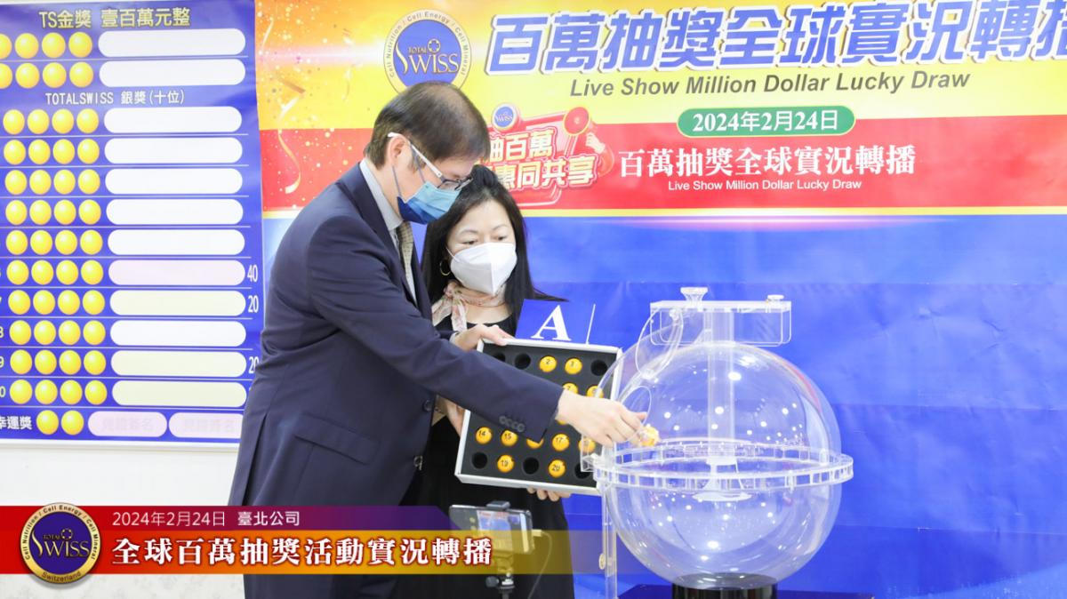 2024年2月24日下午,第26回Total Swiss全球百萬抽獎在台北公司七樓舉行,抽獎實況並透過視訊與全球各公司據點同步進行。