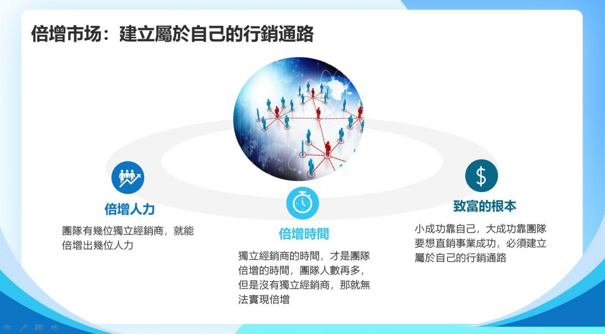 除了從單純消費角度來看,消費者加入會員,還可以擁有自己建立通路的權利,在公司出產品、出資源、出場地、請員工的情況下,會員可以使用公司提供的大量資源來建立銷售三冠王、素蛋白、藻油、Time Solution、Air Solution、Water Solution這系列第一名產品的通路。
