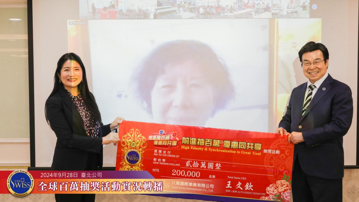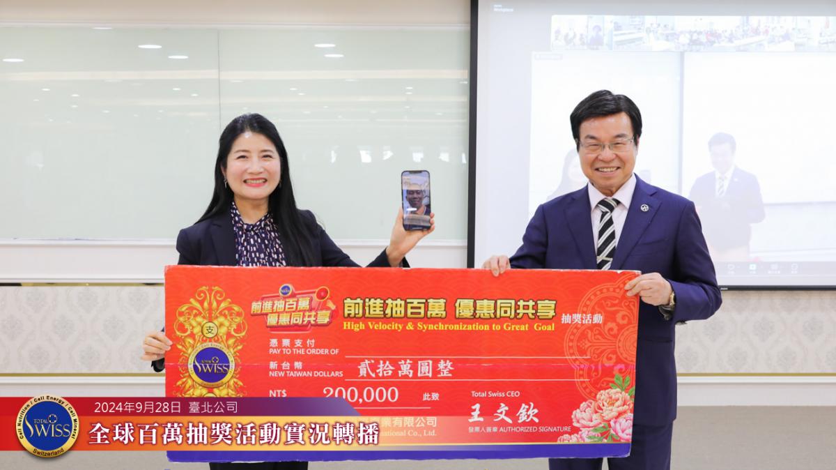 另一位百萬得獎人則是周朝瑞總裁底下一位剛剛加入沒多久的下線,王博士也藉此強調,連新人都可以中一百萬,Total Swiss的抽獎是最公平的,他鼓勵大家說:「不要擔心Total Swiss百萬抽獎會停止,大家要盡量把一帶五往下延伸下去。」