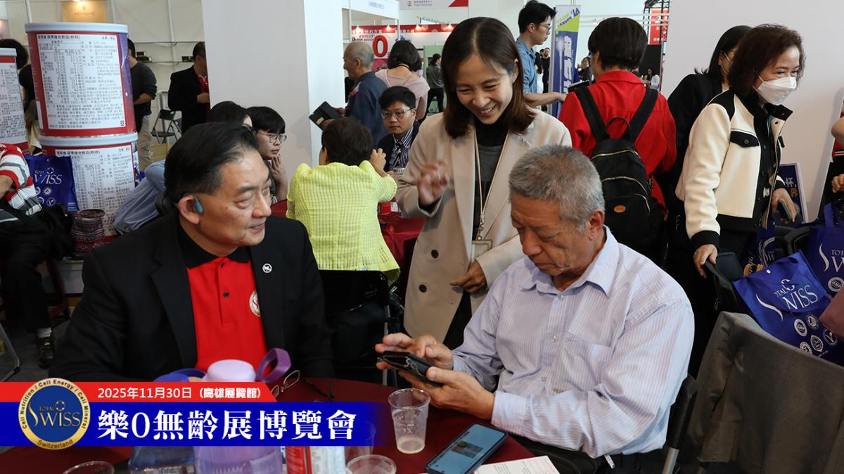 除了公司安排的洽談桌椅座無虛席外,Total Swiss展位靠近落地窗的場邊空地,也被超過十組夥伴用作臨時的分享溝通場所。因此,在高雄展覽館樂齡展現場,除了有好幾組夥伴主動出擊、舉牌邀約之外,還有近20組夥伴同時在跟體驗者進行進一步的溝通。