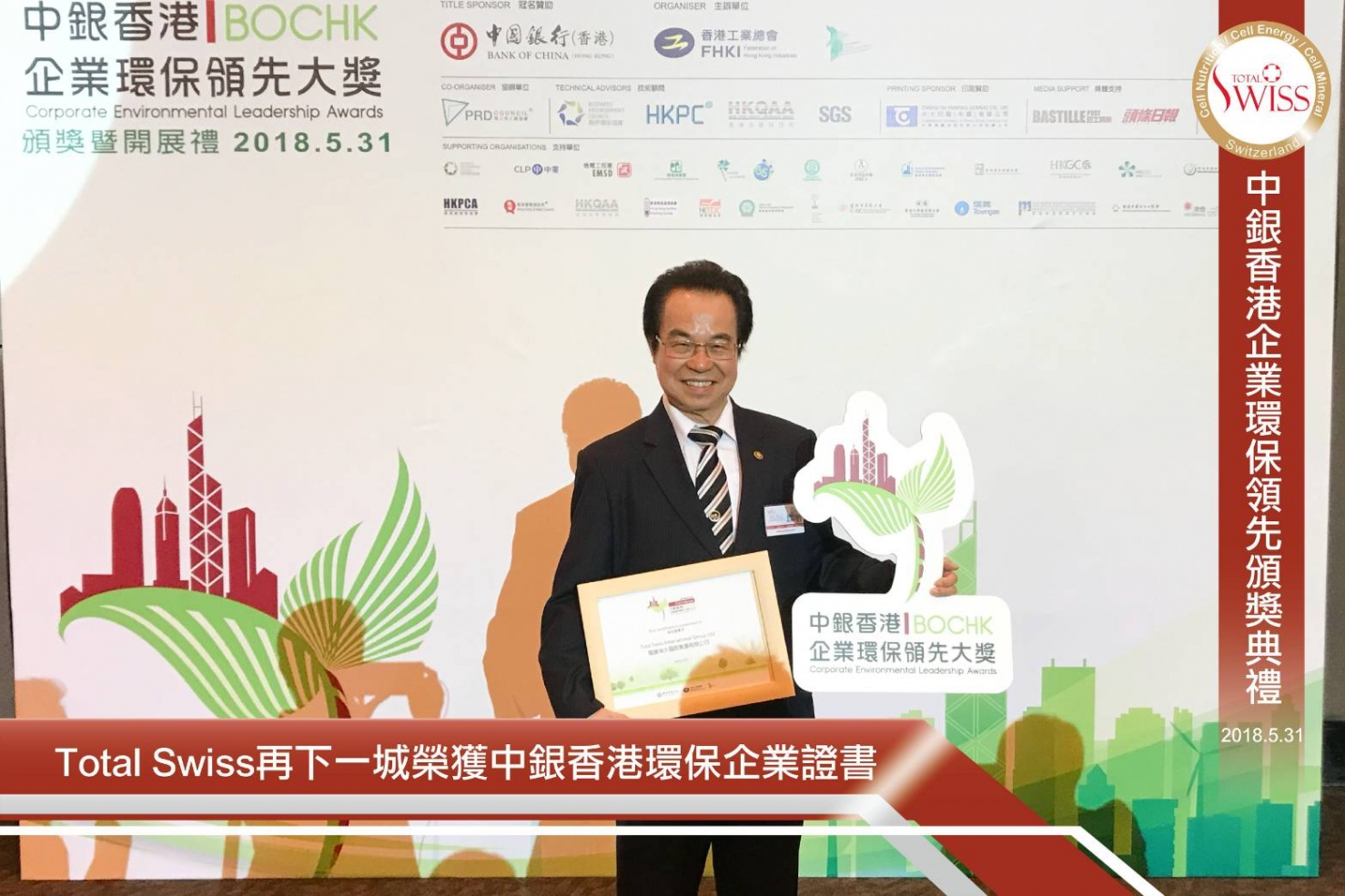 繼2015年榮獲聯合國世界綠色組織頒發綠色辦公室(Green Office)榮譽後,Total Swiss於2018年再度榮獲環保大獎,獲頒中國銀行(香港)和香港工業總會聯合舉辦的「中銀香港企業環保領先大獎-環保優秀企業證書」。